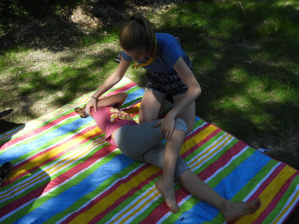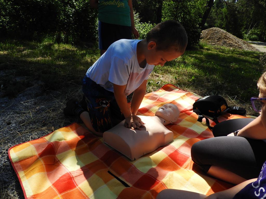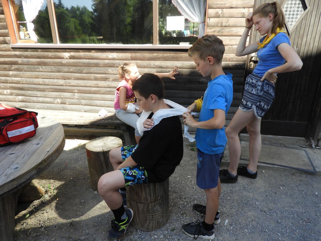 Prehitro je prišla nedelja in z njo zadnji dan našega kampiranja. Izkoristili smo jo za pridobivanje znanja iz prve pomoči na različnih točkah. Mentorji so predstavili položaj za nezavestnega, oživljanje, povijanje ran ter namestitev poškodovanca na nosila. Svoje znanje so skupine nato prikazale na zadnji točki. Najprej so z brentačo pogasile maketo goreče hiške ter nato oskrbele poškodovanca v njej. Potem so sledile štafetne igre, kjer so otroci zopet zagrizeno tekmovali. Zadnji dan smo zaključili z nogometno tekmo, kjer so fantje v vlogi Liverpoola in Chelsea odigrali finale Lige prvakov, punce pa so jih medtem spodbujale s tribun. Po tekmi smo vzeli vsak svoj nahrbtnik ter se polni lepih spominov vrnili nazaj domov.