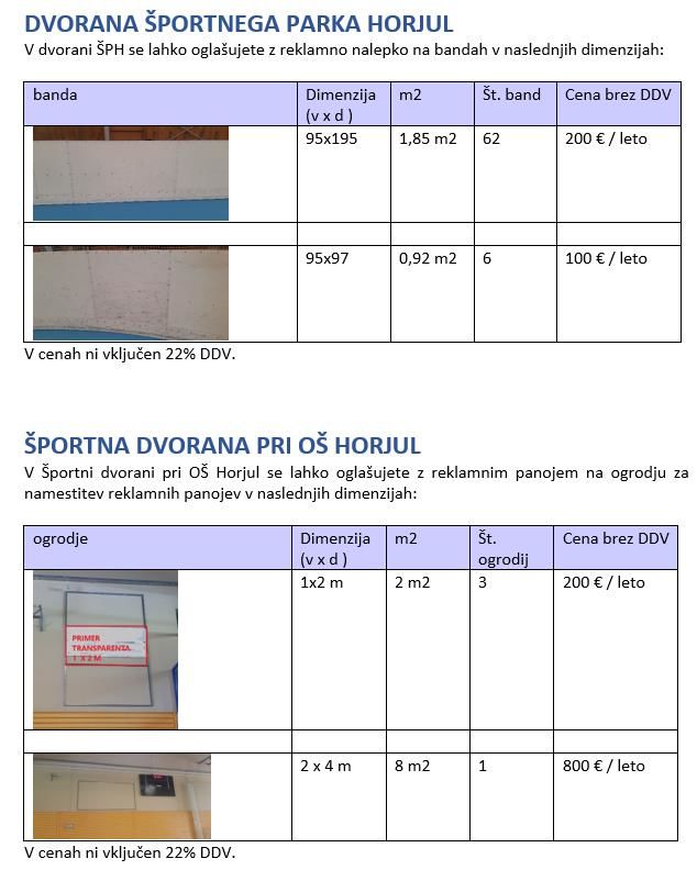 V dvorani športnega parka Horjul se lahko oglašuje z reklamno nalepko na "bandah" v naslednjih dimenzijah: - 95 x 195 cm (1,85 m2), 62 band, cena brez DDV je 200 €