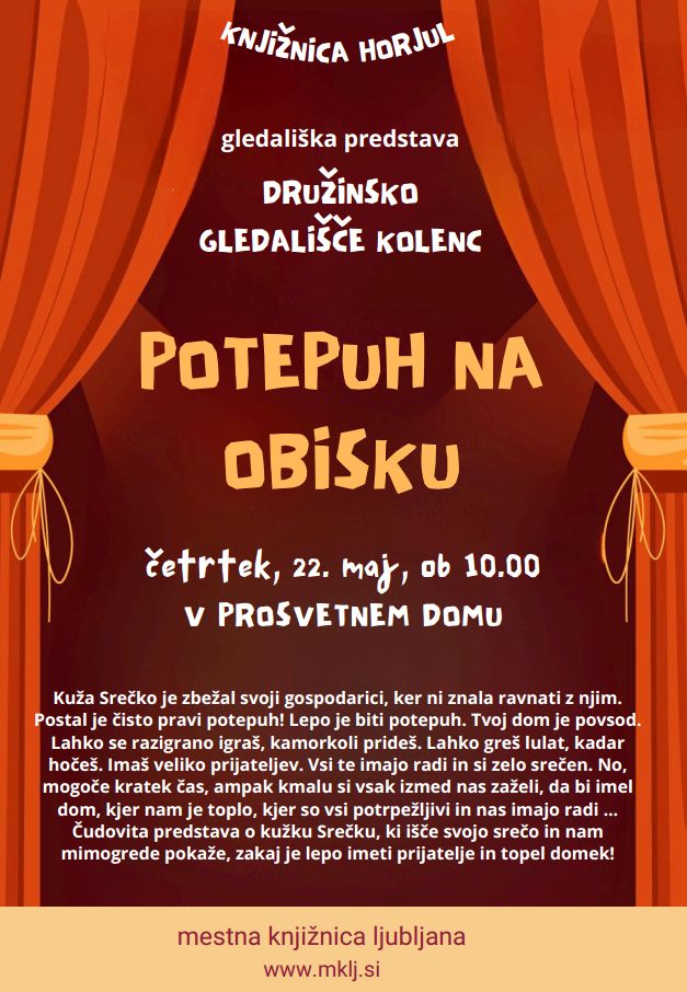 Vabimo vas na otroško predstavo Potepuh na obisku, v izvedbi družinskega gledališča Kolenc. Predstava bo v četrtek, 22. 5. 2025 ob 10. uri v Prosvetnem domu v Horjulu.