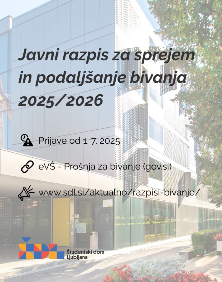 Ministrstvo za visoko šolstvo, znanost in inovacije je objavilo Razpis za sprejem in podaljšanje bivanja študentov višješolskega in visokošolskega študija v študentskih domovih in pri zasebnikih za študijsko leto 2025/2026, vendar je prijava na razpis mogoča šele od 1. 7. 2025 dalje.