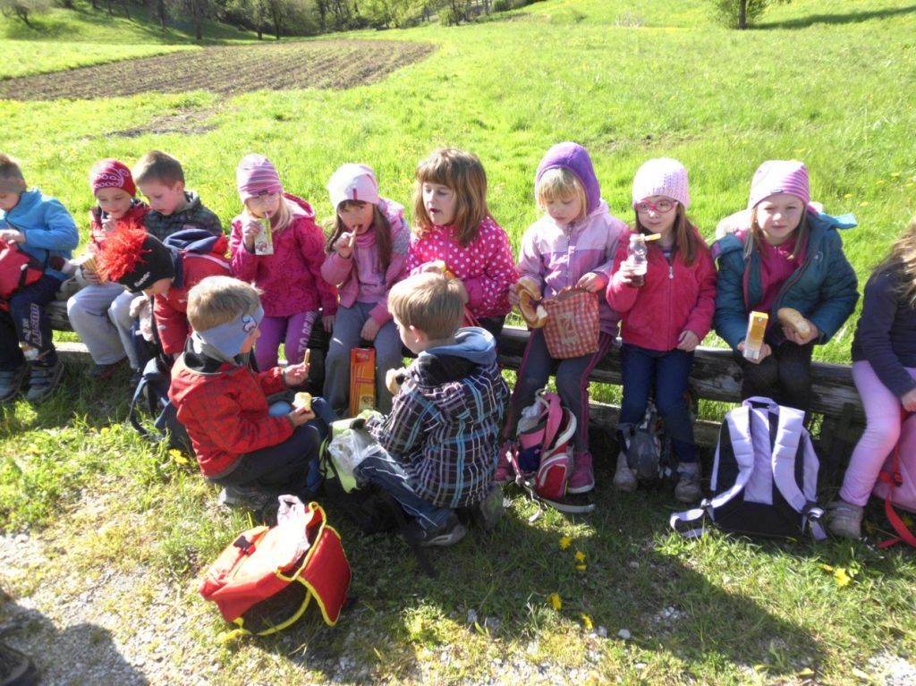 Na vrsti je bila malica, na katero so otroci čakali, še preden smo se sploh dobro odpravili na pot. Čokolade, sendviči, sadje, bomboni, suho sadje in še marsikaj se je skrivalo v otroških nahrbtnikih, ki so že komaj čakali, da jih otroci odprejo in se posladkajo z njihovimi dobrotami. Potem ko so si potešili začetno lakoto, je sledilo pokušanje sosedovih dobrot. Po koncu malice pa smo pobrali svoje smeti, jih spravili v nahrbtnik in se z veliko lažjim korakom odpravili čez Lipalico nazaj proti vrtcu. Šli smo po kolovozu, tako da je bila pot bolj sproščena in smo se namesto avtomobilom morali izogibati le lužam, ki so bile na poti.