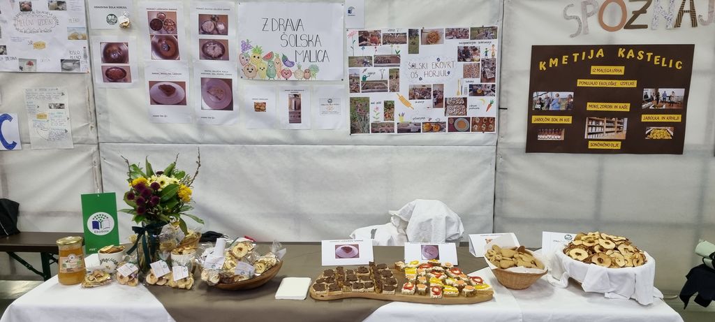 Že na začetku šolskega leta sva se odločili, da bo naslov najine predstavitve na stojnici Zdrava šolska malica. V šolski kuhinji so ravno kupili aparat za izdelovanje domačih namazov, torej da ne kupujejo namazov, ampak jih s pomočjo aparata kuharice pripravijo same. Tako lahko poskrbimo za zdravo malico učencev. Na šolskem vrtu rastejo zelišča, zato sva se domislili, da bi pripravili zeliščni namaz za slano jed, Nataša pa se je domislila lešnikovega namaza iz samo treh sestavin, ki po okusu spominja na nutelo, a je veliko bolj zdrav, ker nima dodanega sladkorja. Sodelovanje z lokalnimi ponudniki pa sva prikazali tako, da je Nataša pri pouku gospodinjstva z učenci spekla medenjake iz medu lokalnega pridelovalca medu. Na stojnici sva še ponudili jabolčne hrustavčke (sušena jabolka). Pripravili sva še slikovni prikaz izdelave obeh namazov in katere aktivnosti izvajamo v okviru delovanja interesne dejavnosti Šolski ekovrt.