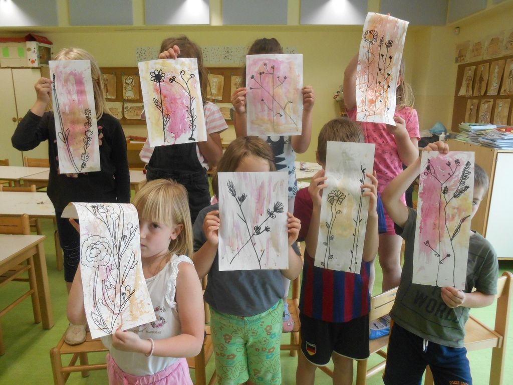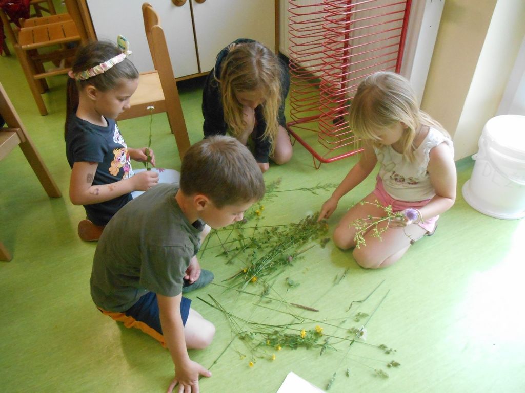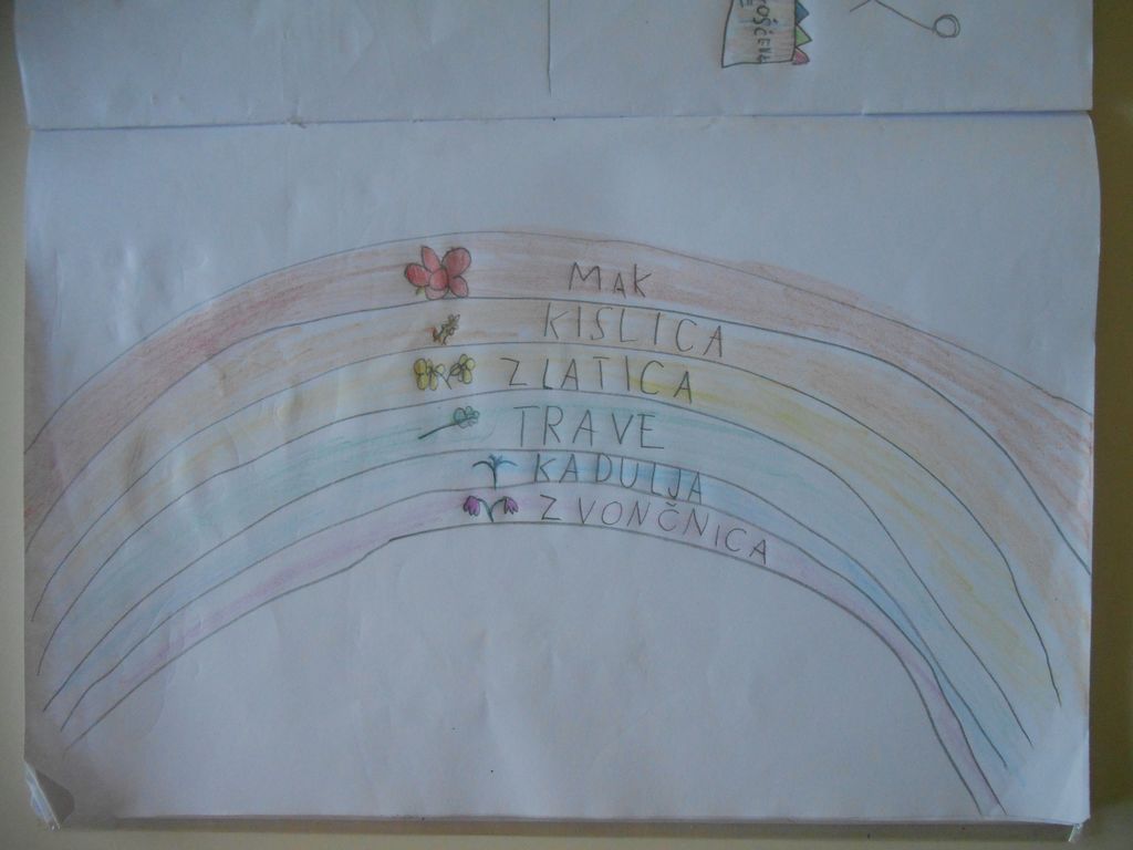 Zaradi muhastega zgodnjega poletja Horjulci letos še niso pokosili vseh travnikov in pospravili vsega sena. Poskusili smo se spomniti imena poletnih travniških rastlin v vseh barvah, ki sestavljajo mavrico jih poiskati med visokimi travami. Pred učilnico smo s kredami narisali mavrico in jo pokrili s prinesenimi cvetlicami. Cvetlice smo narisali na liste in liste pobarvali z barvami, ki jih je učiteljica skuhala iz rastlin in stvari, ki jih je našla v kuhinjskih omarah. Namesto čopičev smo uporabili latje trav in bilo je prav zabavno.