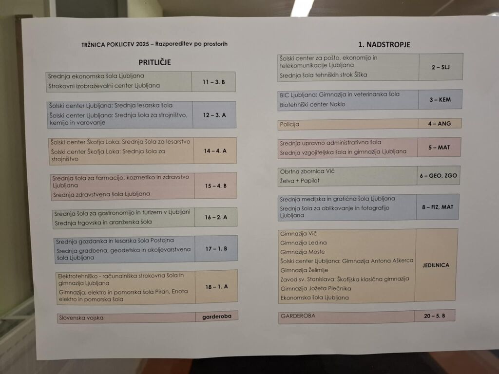 V prostorih šole so se predstavile številne srednje šole z različnih področij – tehniške, naravoslovne, umetniške, družboslovne in zdravstvene. Obiskovalci so lahko spoznali programe poklicnih in strokovnih šol, različne gimnazijske smeri ter posebne izobraževalne poti, ki jih ponujajo manjše, specializirane ustanove. Poleg srednjih šol so sodelovale tudi nekatere institucije, ki so povezane s poklicnim izobraževanjem, kar je še razširilo nabor informacij za devetošolce.