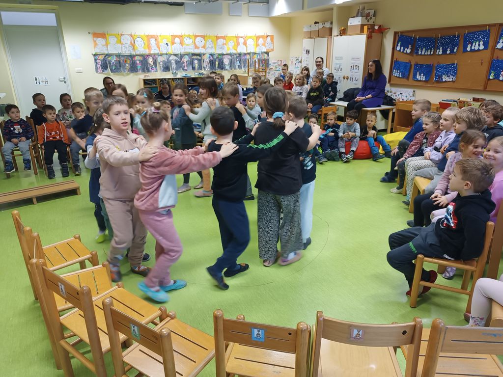 Bila je zima in december je čarobno zadišal po drobnih pozornostih in po času, ki ga darujemo drug drugemu. Prvošolci smo se naučili veliko pesmic in pravljice, ki nam jih ob jutrih bereta učiteljici, radi zaigramo. Veseli smo bili, ko sta nam učiteljici predlagali, da povabimo vrtičkarje in nestrpno smo čakali na naše srečanje, da pokažemo, kaj vse že znamo. Povabili smo metulje in čebele  in njihove vzgojiteljice. Zaigrali smo jim igrico Sedem medvedov. Zaplesali smo ob pesmi Abraham ma sedem sinov. Pravljica pravi, da se bodo medvedki spet srečali čez trikrat tri dni, mi pa smo se z vrtičkarji  srečali spet pomladi.