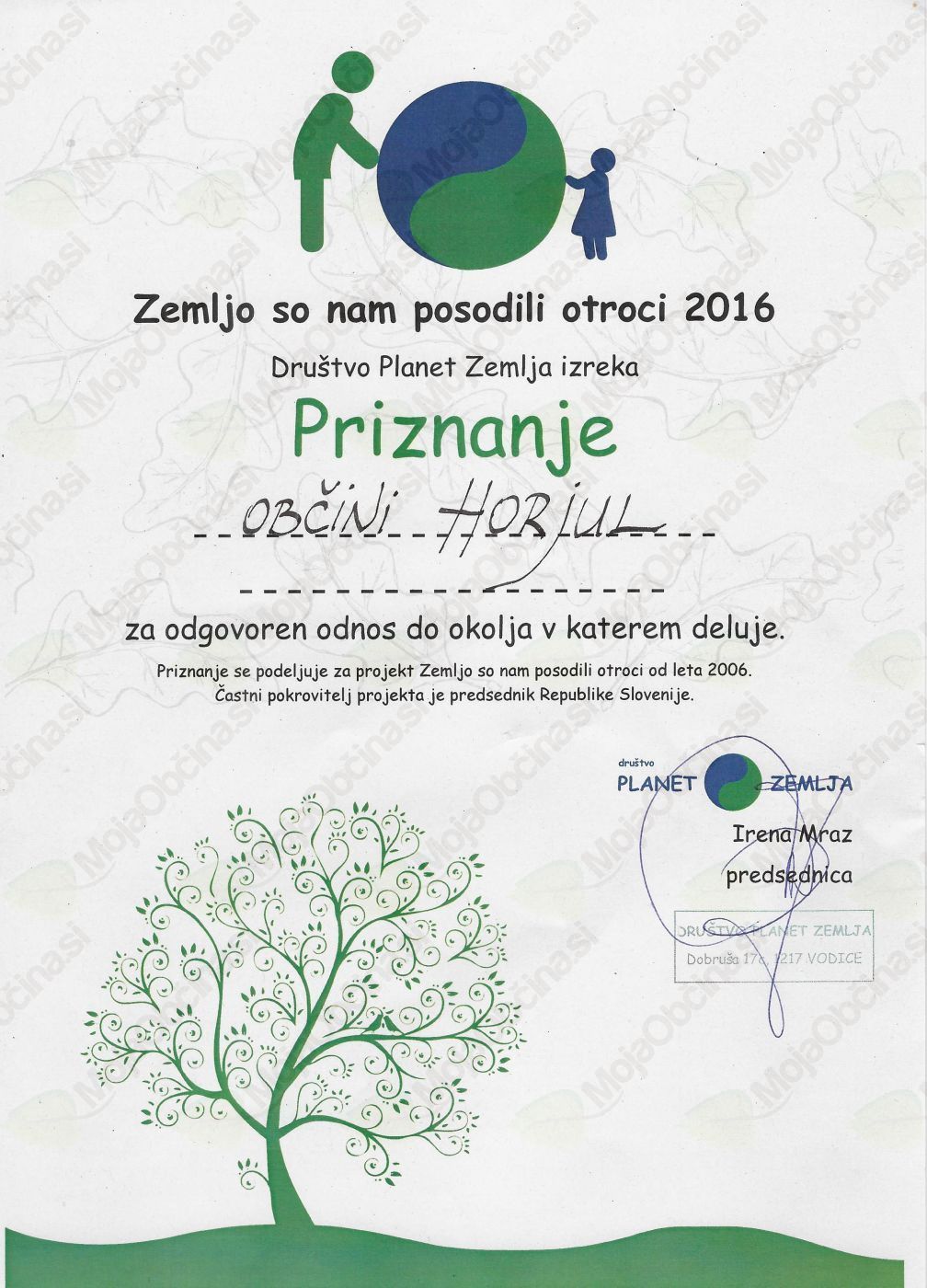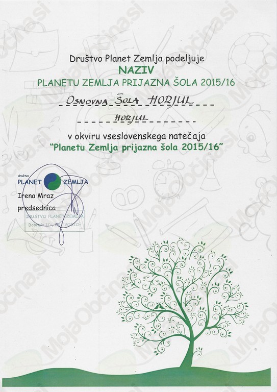 Tudi letos smo osvojili nagrado v kategorji voda. Nominirali smo Občino Horjul, ki veliko prispeva k ohranjanju voda. Ker smo sodelovali z dvema okoljskima projektoma, je šola prejela naziv Planetu prijazna šola.