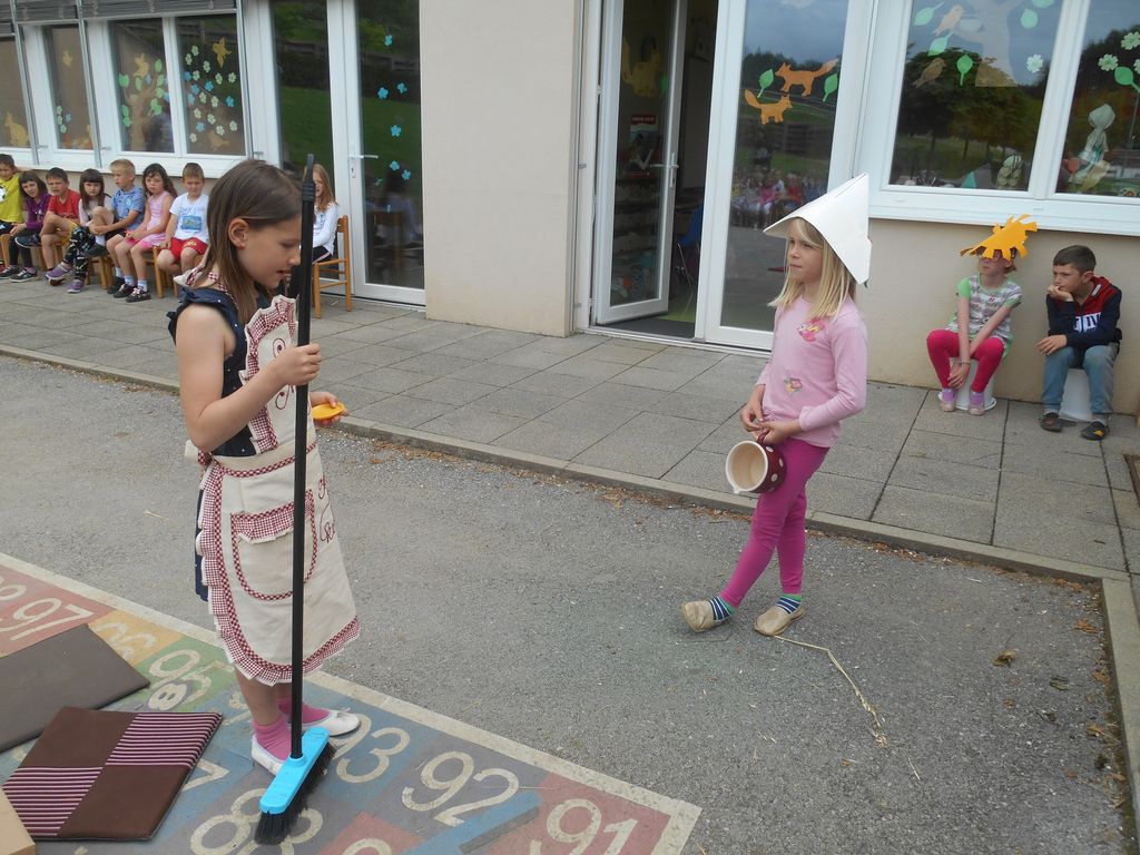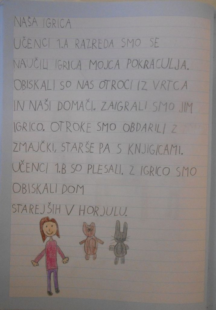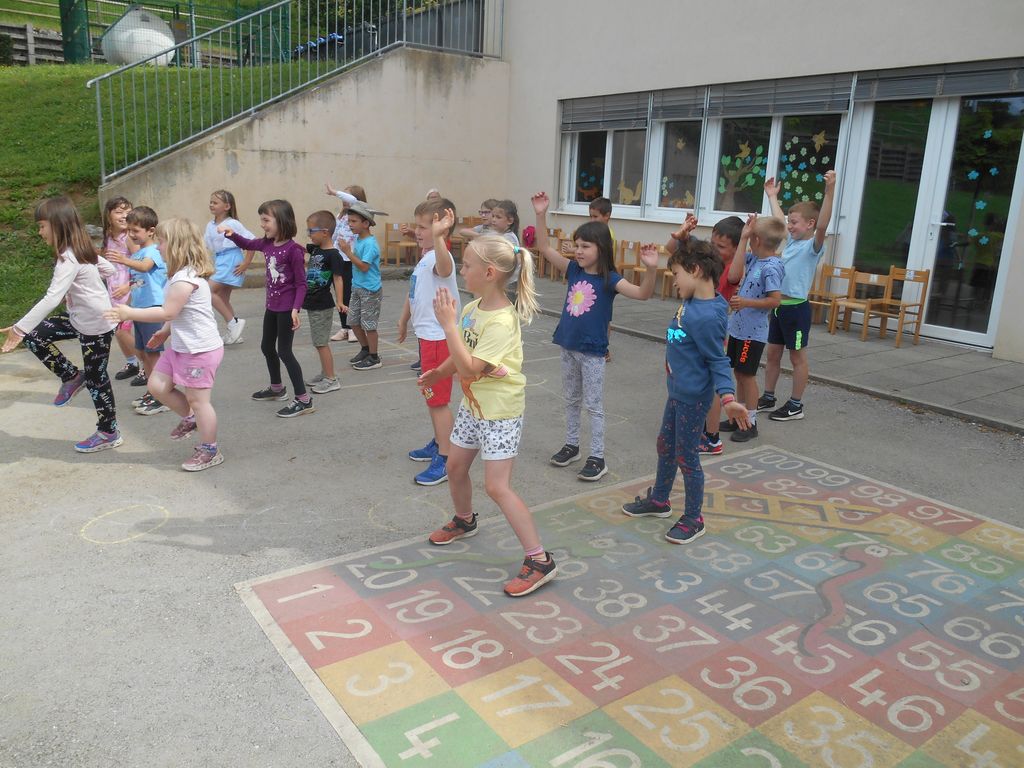 Šolsko leto se izteka, mi pa smo Mojco Pokrajculjo že kar dobro znali. Učence 1.b je učiteljica Irena pri glasbi naučila otroške plese in skupaj smo povabili otroke iz horjulskega vrtca. Ti otroci so že skoraj prerasli vrtec, v jeseni se nam bodo pridružili v šoli. Zaigrali smo jim igrico in jim zaplesali, obdarili smo jih z zmajčki, ki smo jih izdelali zanje, in se skupaj igrali na igralih ob šoli.