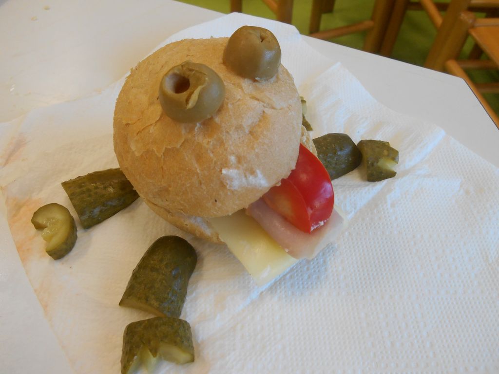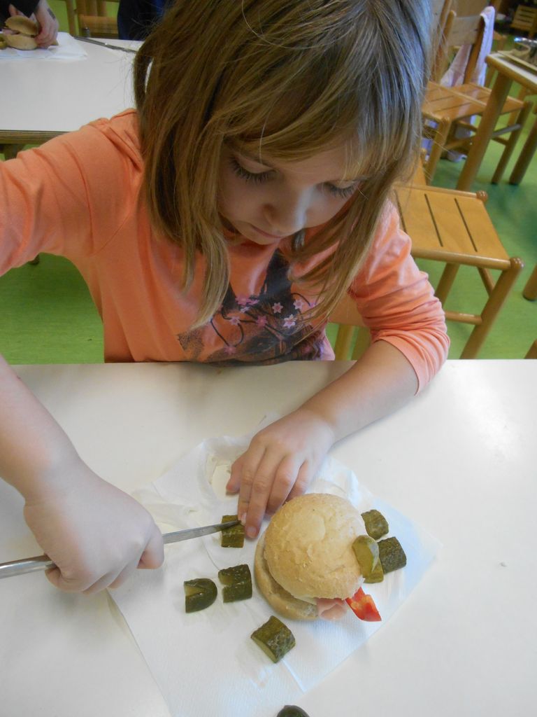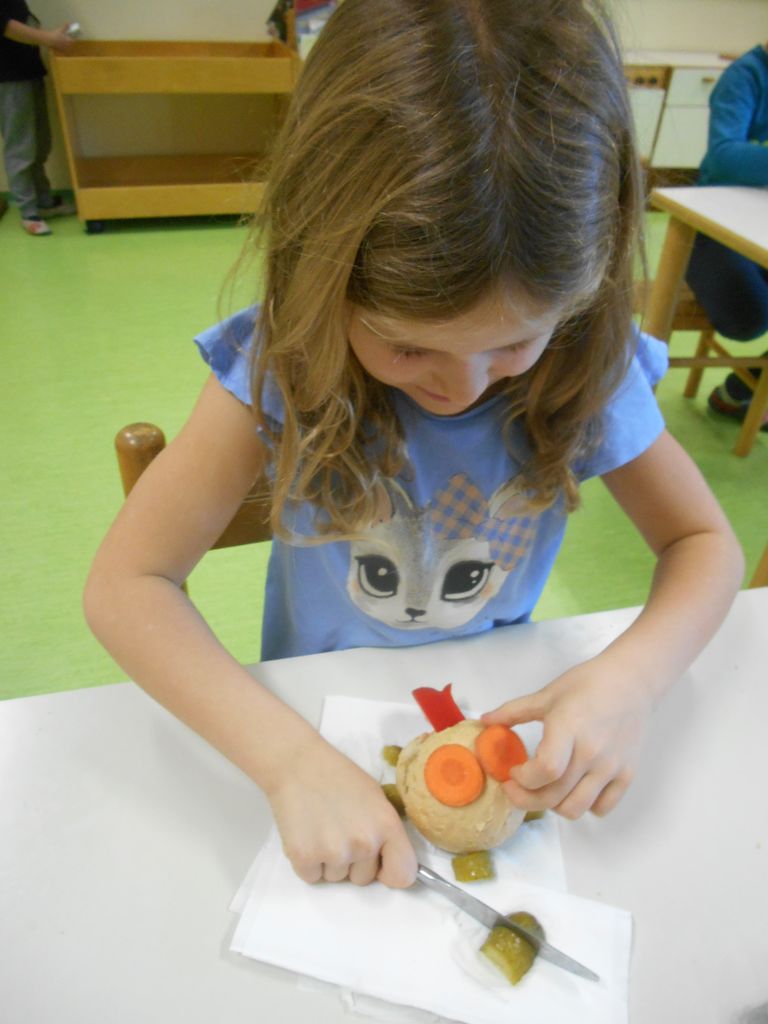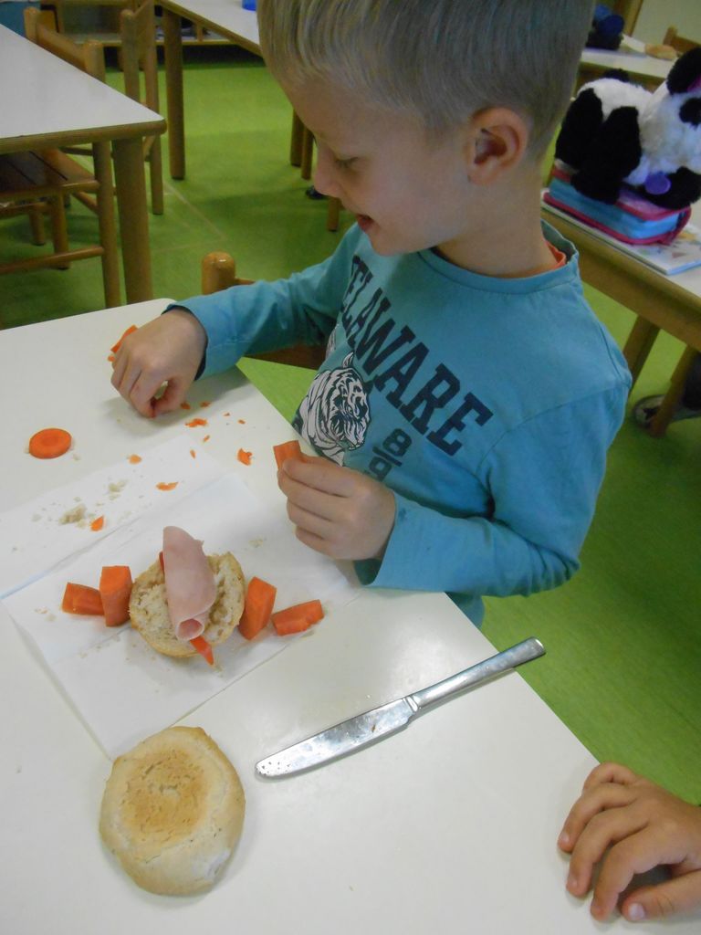 Prvošolci smo si šolsko malico pripravili sami. Iz šolske kuhinje smo prinesli živila, iz katerih smo si sami pripravili zdrav obrok. Iz štručke, sira, rezine šunke in veliko raznovrstne zelenjave smo pripravili posebne sendviče za prvošolce. Ker smo jih pripravili sami, so nam še bolj teknili. Iz čisto vsakdanjih sestavin smo oblikovali igrive krokodilčke. Ugajali pa niso le našim želodčkom, temveč so bili tudi prava paša za oči.