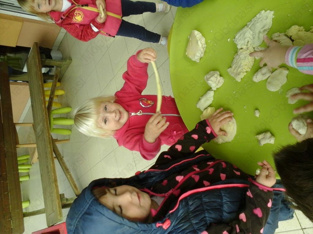 Slano testo otroke vedno pritegne. Letos je bilo še posebej zanimivo, saj smo pripravili testo različnih barv in vonjev. Na terasah smo uredili več kotičkov, v katerih so se otroci iz vseh skupin družili in ustvarjali iz testa. Najmlajši otroci so ga trgali, gnetli in vanj odtiskovali, pod rokami starejših otrok pa so nastajali že bolj stvarni izdelki. Oblikovali so palačinke, piškotke in tortice, različne živali in pravljična bitja. Marsikateri otroški izdelek je oživel s pesmijo ali kratkim improviziranim dialogom. Po končanem dopoldnevu smo testo prenesli v igralnice in v kotičkih z njim ustvarjali še v naslednjih dneh.