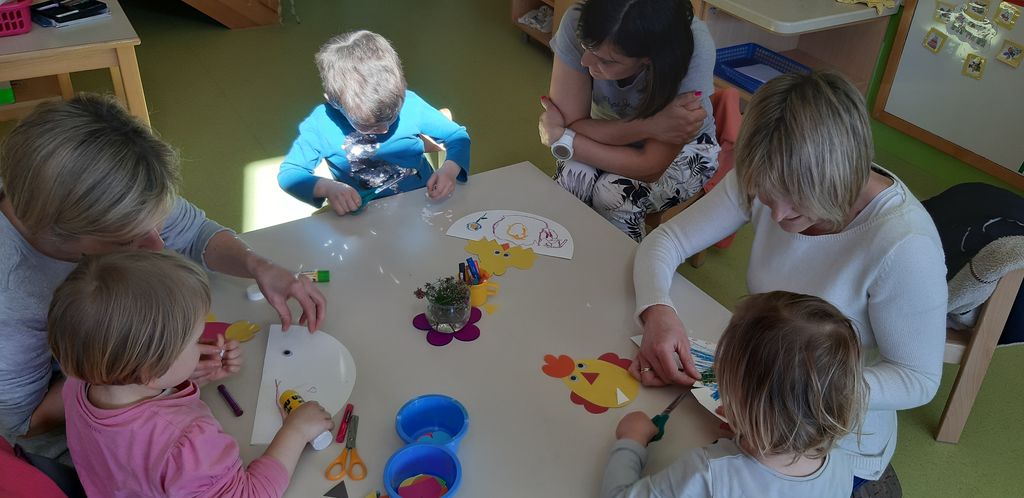 Pri Mravljah so prav tako pripravili likovno delavnico – skupaj s starši so malčki iz barvnega papirja izdelali piščančke, ki so se izlegli iz jajčk. Po dejavnosti so staršem razkazali igralnico in s čim se najraje igrajo.