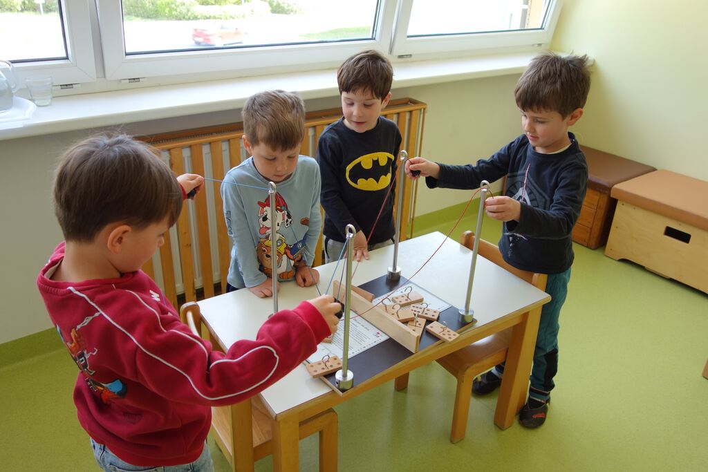 Osebje Hiše eksperimentov se je v jutranjih urah s kombijem pripeljalo do vrtca. V telovadnici so na mizah pripravili 60 mobilnih interaktivnih eksperimentov. Vsak eksperiment je vseboval potrebne pripomočke in kratka, ilustrirana navodila, ki so nam omogočala karseda samostojno raziskovanje. Med eksperimentiranjem smo postavljali vprašanja in sami aktivno iskali odgovore nanje. Spoznali smo, da je Luna močno oddaljena od planeta Zemlje in da dovolj močan magnet lahko ustavi peščeno uro z železnim prahom. Ko smo pogledali skozi lupo, je bil svet popolnoma drugačen - obrnjen na glavo, če smo si nadeli barvna očala, pa nenavadno barvit. Izvedli smo ogromno različnih eksperimentov in prav vsak je na naš obraz narisal velik nasmeh. Skupaj z osebjem Hiše eksperimentov smo tudi preko napak odkrivali nova znanja in spoznavali, da je učenje lahko res zanimivo.