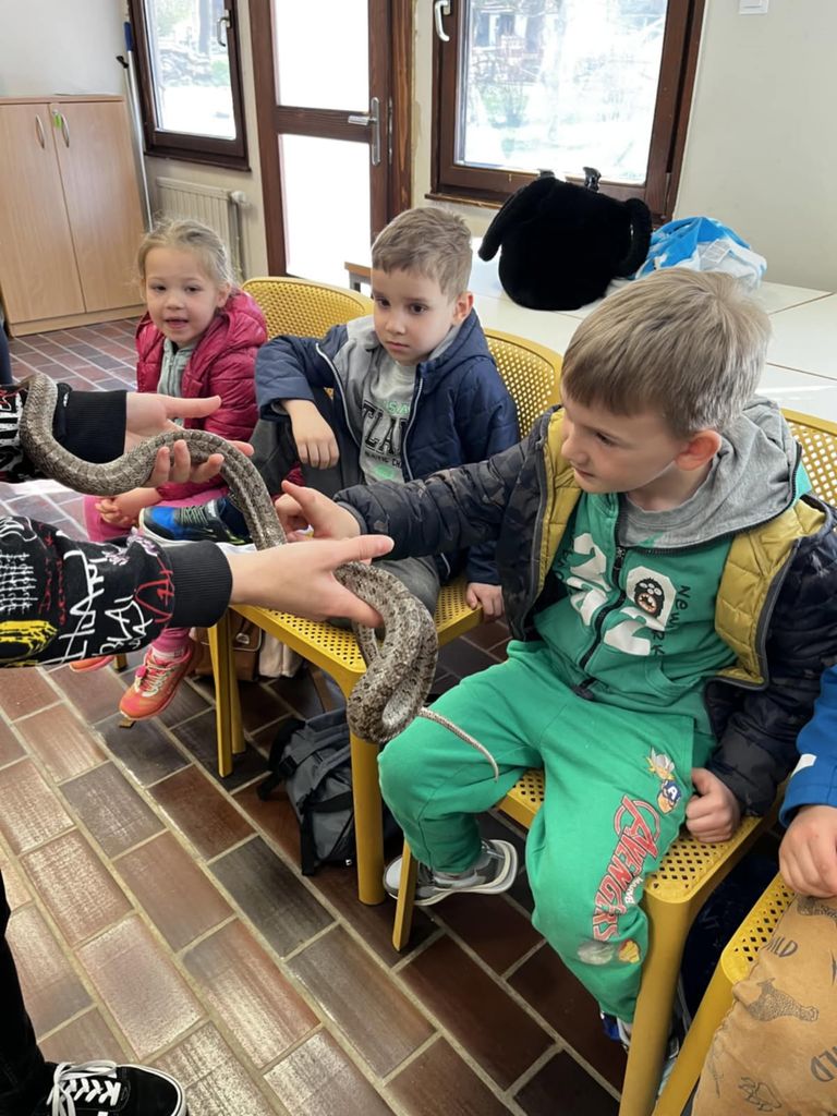 Na koncu ogleda je sledilo posebno doživetje – vodička je otrokom pobliže pokazala nekaj živali, ki so se jih lahko tudi dotaknili. Na rokah so držali nežno grlico, občudovali kačo, ki se je mirno plazila po njihovih rokah in si od blizu ogledali želvo z njenim trdim oklepom.