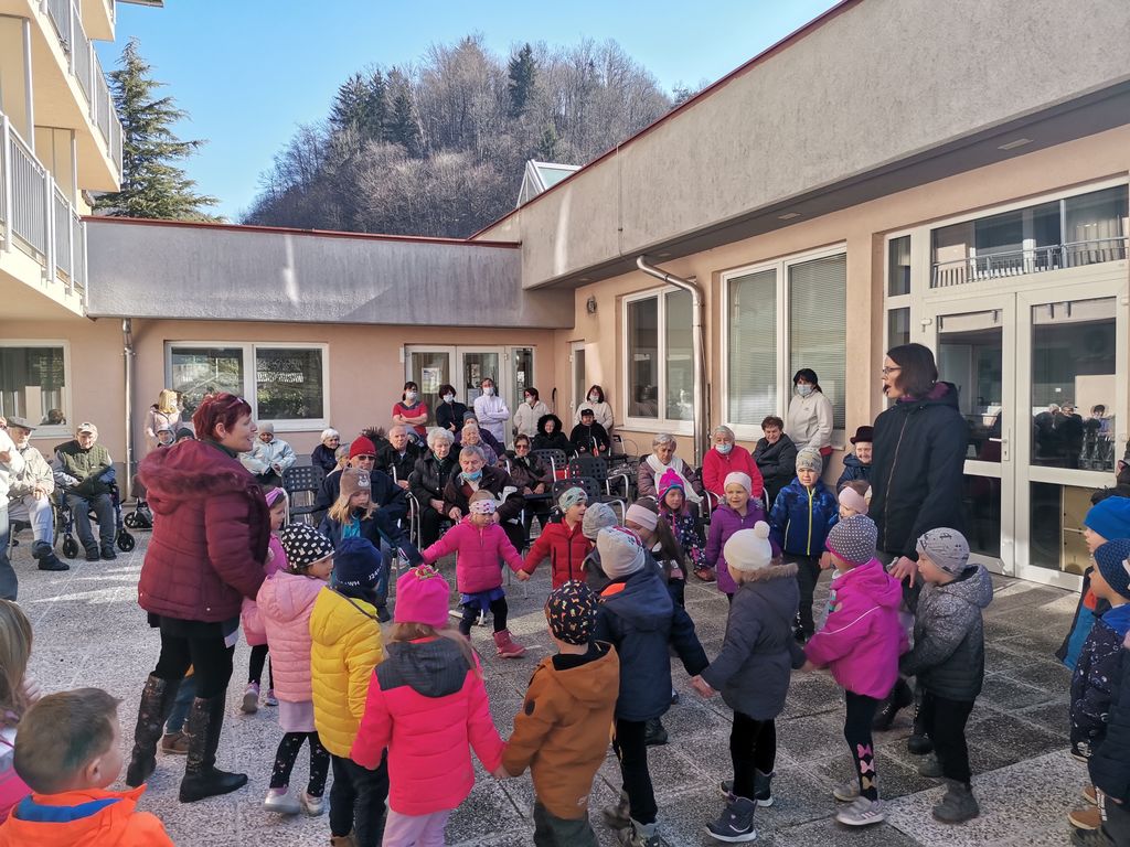 Otroci iz horjulskega vrtca smo varovancem v Domu starejših občanov v Horjulu izkazali posebno pozornost. Na sončen marčevski dan so nas na dvorišču pred Domom pričakali starostniki, ki smo jim otroci iz skupine Pikapolonice, Murni, Čebele in Metulji polepšali dan z veselimi pesmicami, zanimivimi recitacijami, plesom in prstnimi igrami. Otrokom bo prav gotovo ostal lep spomin, ko smo z obiskom razveselili starejše ljudi. Prisrčen nastop najmlajših vedno razneži vse prisotne, naša želja pa je, da bi tiste, najstarejše, med nami še dolgo grel nastop najmlajših glasov in jim po svojih najboljših močeh polepšal jesenske dni življenja.