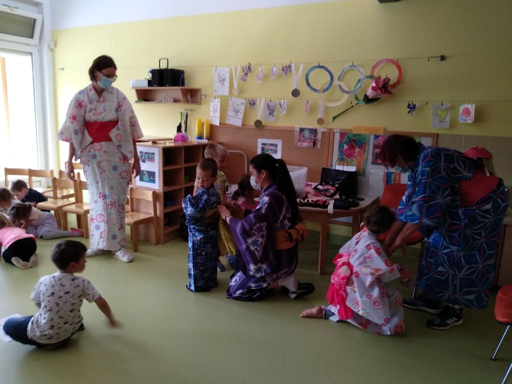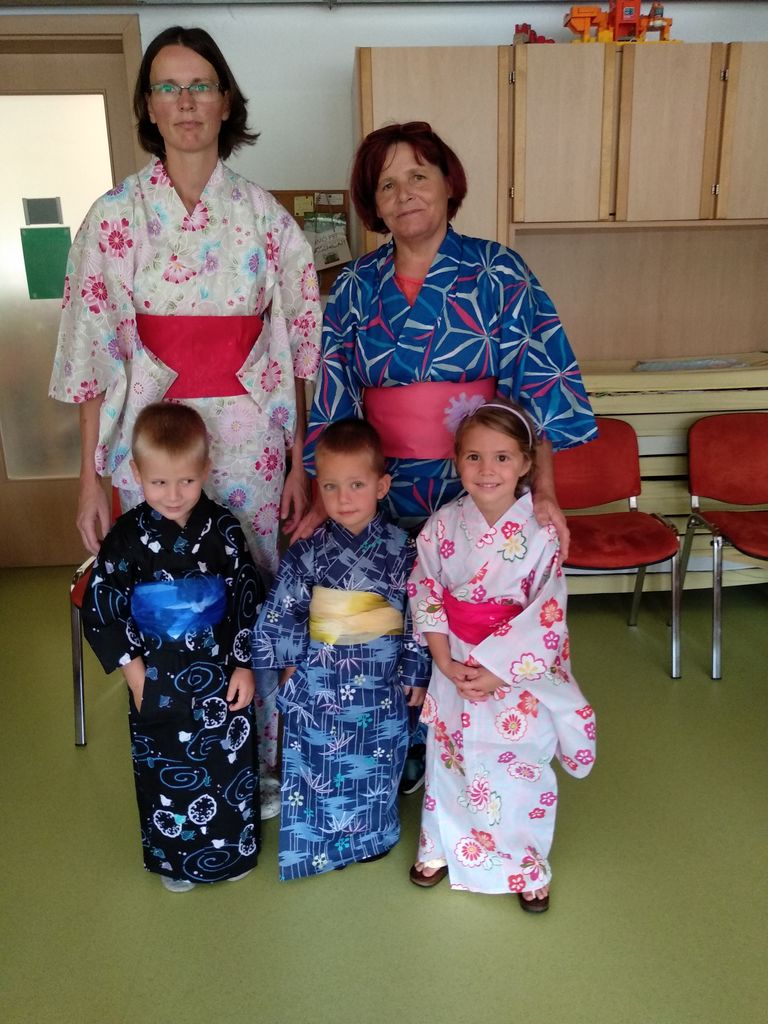 Tudi mi smo za naše goste pripravili presenečenje. Zapeli in zaplesali smo jim nekaj pesmic in plesov. Z veleposlaništva Japonske sta prišli dve gospe, ena je doma prav na Japonskem. Obiskujeta vrtce in razveseljujeta otroke z zanimivimi delavnicami. S seboj sta prinesli kimone, tradicionalna japonska oblačila, ki so danes pojmovana kot narodna noša.