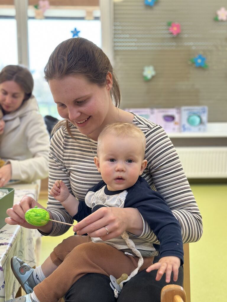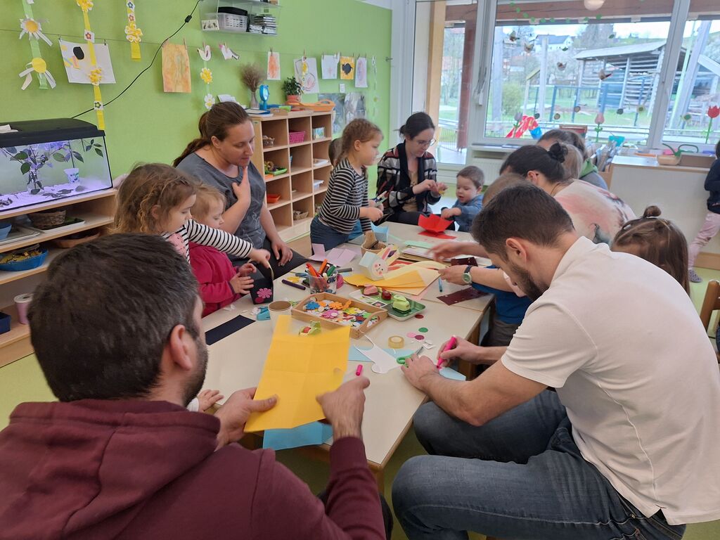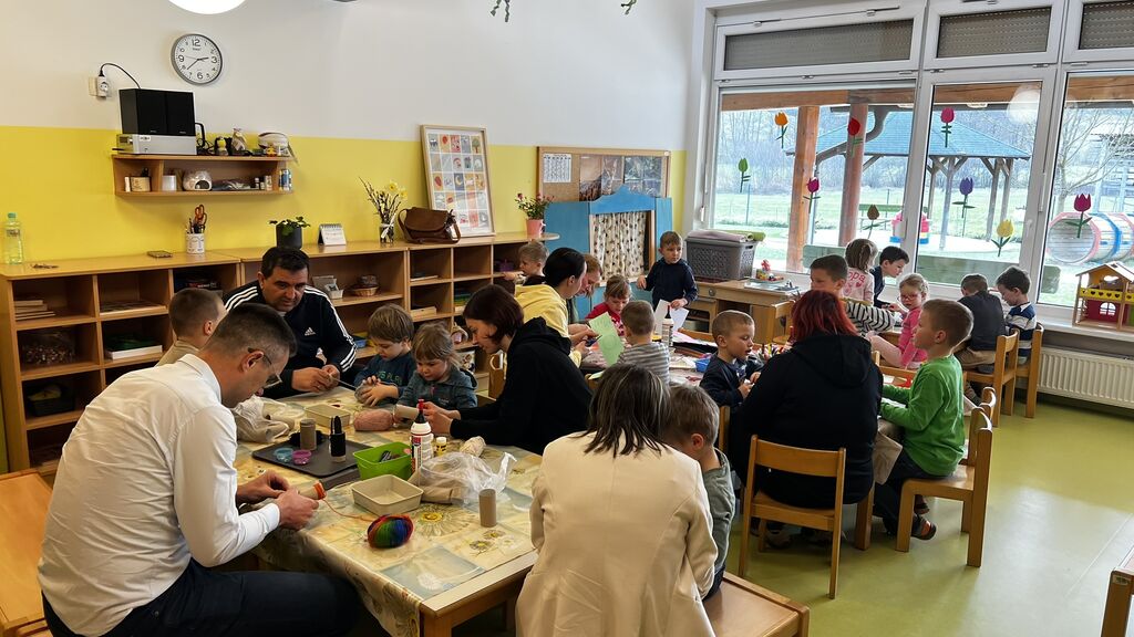 delavnic. Otroci so s starši izdelovali različne pomladne izdelke, ustvarjali z