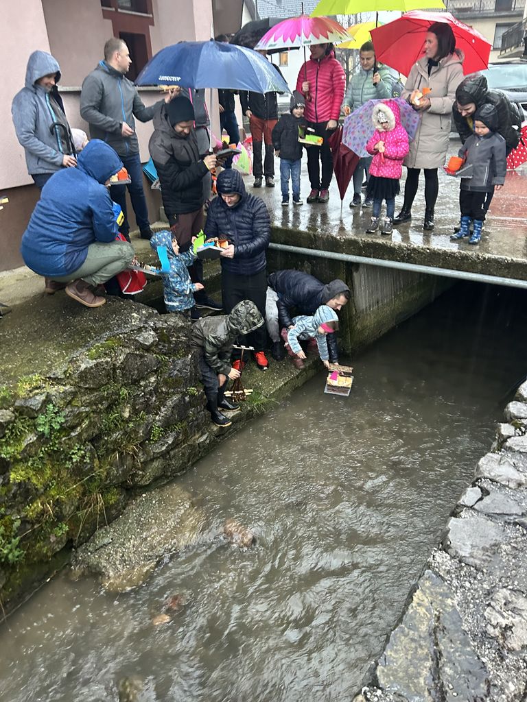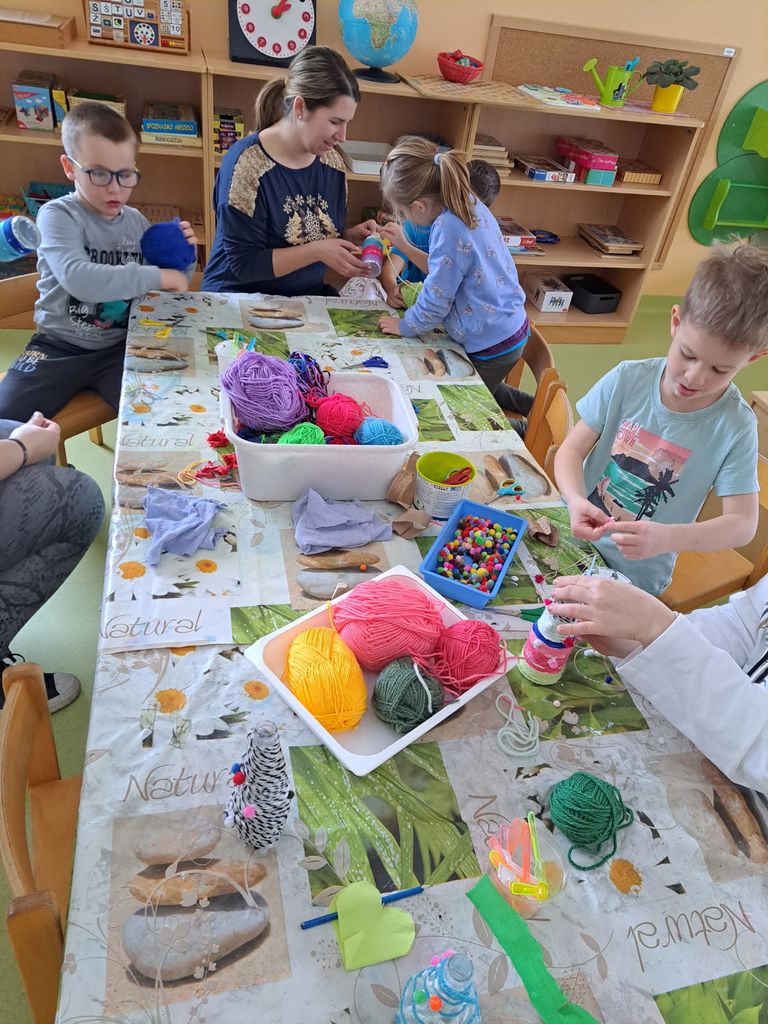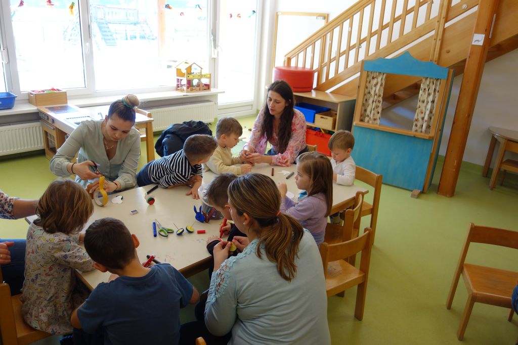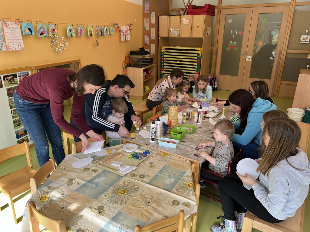Veliko srečanj s starši je bilo ustvarjalno obarvanih. V skupini gosenice so otroci skupaj s svojimi starši izdelovali pisane pomladne metulje iz tulcev, okrašene z barvnim krep-papirjem. Čmrlji so izdelovali cvetlične lončke, ki so jih okrasili s cvetlicami in čmrlji. Tudi pri mravljah so otroci skupaj s svojimi starši ustvarjali, in sicer so izdelovali kokoške iz barvnega papirja ter košarice iz lončkov, v katere so posejali semena medovitih rož za čebele. Žabice so izdelovale piščance na paličicah, ki so pokukali iz svojih lupin ter barvite ptice v gnezdih. Ustvarjalno obarvani druženji so imeli tudi pri pikapolonicah, kjer so otroci iz plastičnih zamaškov izdelovali vrtavke in zibalke, ter pri metuljih, kjer so izdelovali vaze in rože s prav posebnimi, dišečimi cvetovi. V skupini Murni so srečanje s starši izvedli na gregorjevo. Otroci so v prvem delu druženja skupaj s starši izdelovali gregorčke – čolničke, nato pa so se peš odpravili do potoka, kjer so izdelane gregorčke spuščali po vodi. Ker je takrat močno deževalo, so izdelani čolnički splavali tudi v lužah.