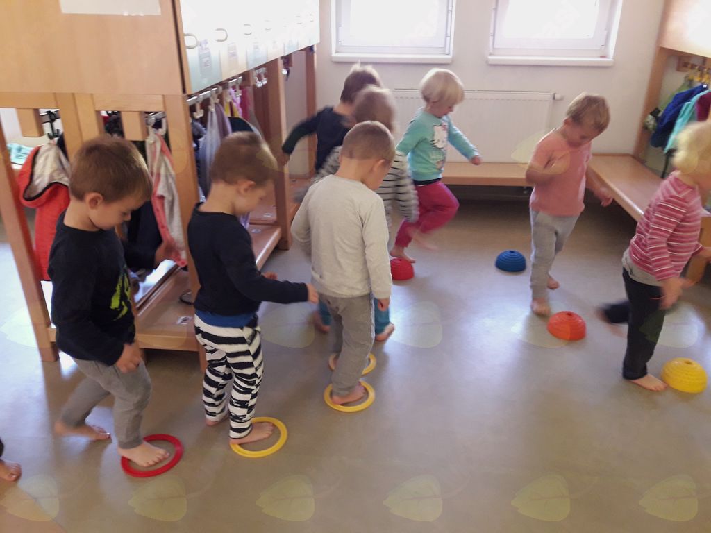 Otroke je na hodniku pričakala malo drugačna pot – čutna pot, na kateri so z bosimi nogami občutili lastnosti različnih materialov, od tkanine, lesa, plastike do jesenskih listov in se ob hoji še umirjali ob klasični glasbi.