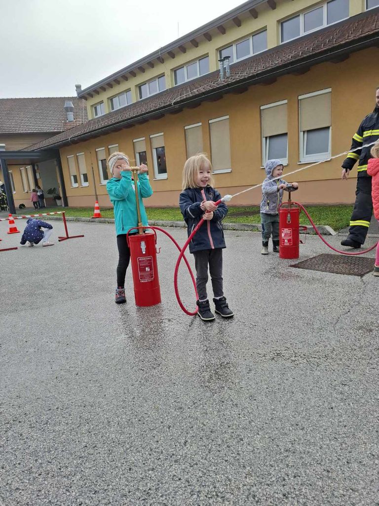 Tokratna vaja evakuacije VVE pri OŠ Horjul je potekala v torek, 22. 10. 2024. Namen vaje je naučiti otroke in zaposlene, kako in kdaj je treba opraviti zapustitev prostorov ter preizkusiti organizacijsko in tehnično pripravljenost za varno in hitro zapustitev igralnic ob morebitnih izrednih razmerah. Po scenariju se je zaradi eksplozije plinske jeklenke zrušil del stavbe, tako da so bili otroci in vzgojiteljice iz dveh vrtčevskih skupin ujeti v eni od igralnic. Po uspešno zaključeni vaji so nam gasilci PGD Horjul pripravili spretnostni poligon. Na njem so se otroci preizkusili v teku čez ovire, z brentačo pa so lahko črpali vodo in gasili plamene na maketi hiške. Ogledali so si tudi gasilsko vozilo in opremo. Gasilci PGD Horjul so otrokom pripravili nepozabno izkušnjo, zato se jim otroci ter zaposleni VVE pri OŠ Horjul iskreno zahvaljujemo za pripravljenost in dobro voljo.