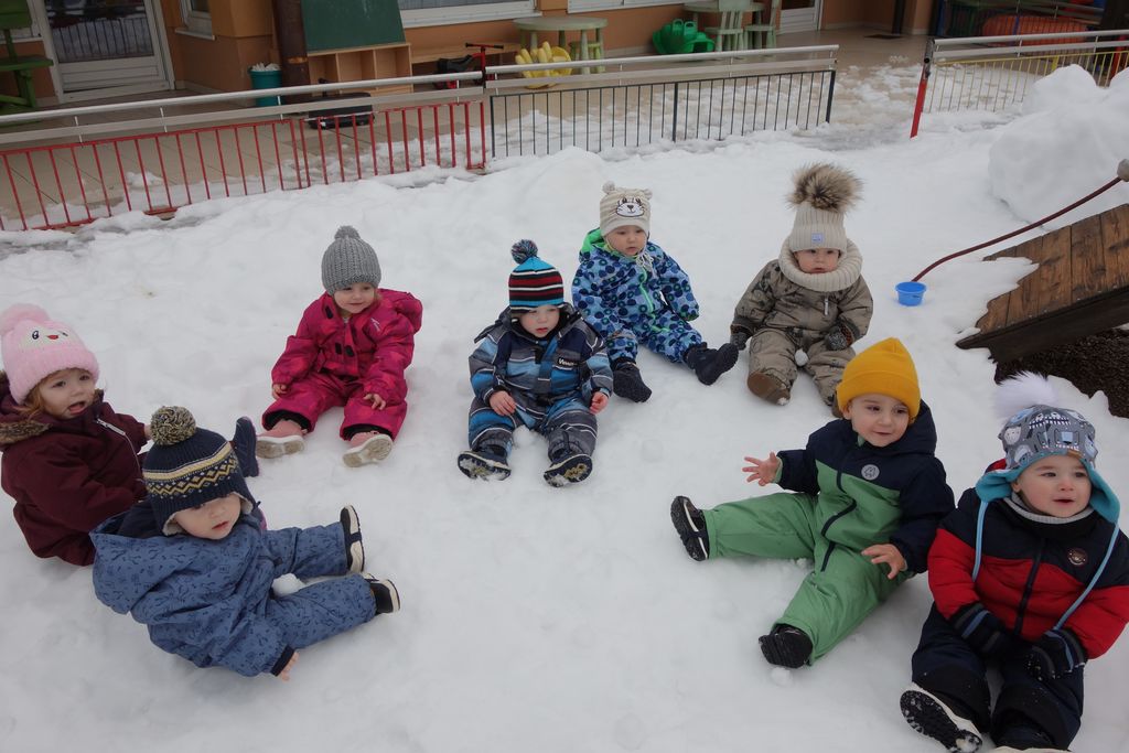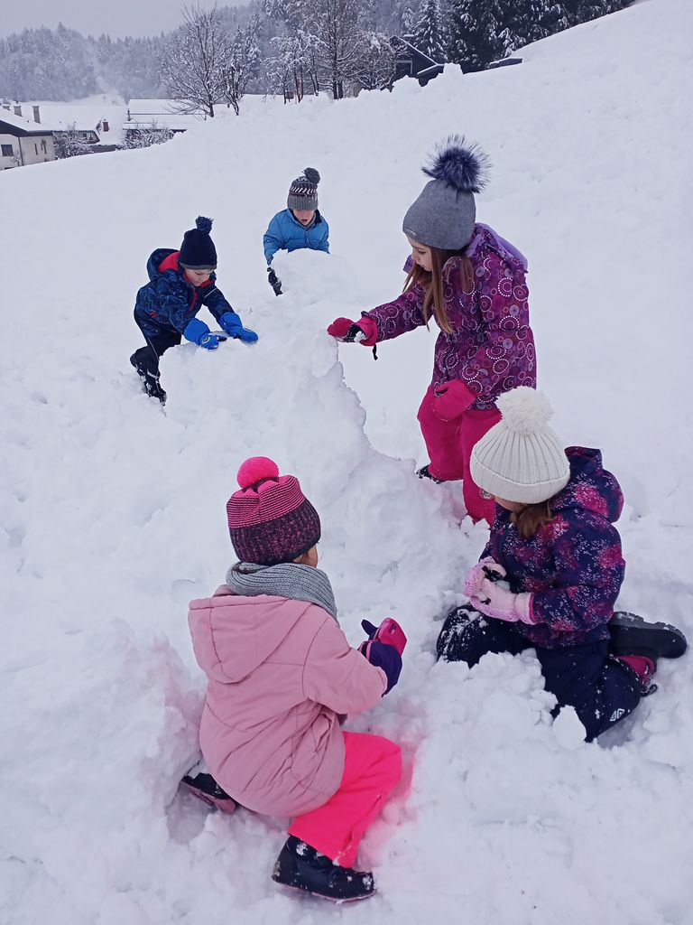 S starejšimi otroki smo so odpravili po zasneženem travniku do bližnjega hriba, kjer smo se dričali po bregu, skakali, delali snežake, valili kepe, si naredili pravo obzidje gradu, kjer so potekale razne gibalne igre. In prav nič nas ni zeblo, uživali smo v zimskih radostih in dan na snegu je hitro minil in bil za nas prekratek.