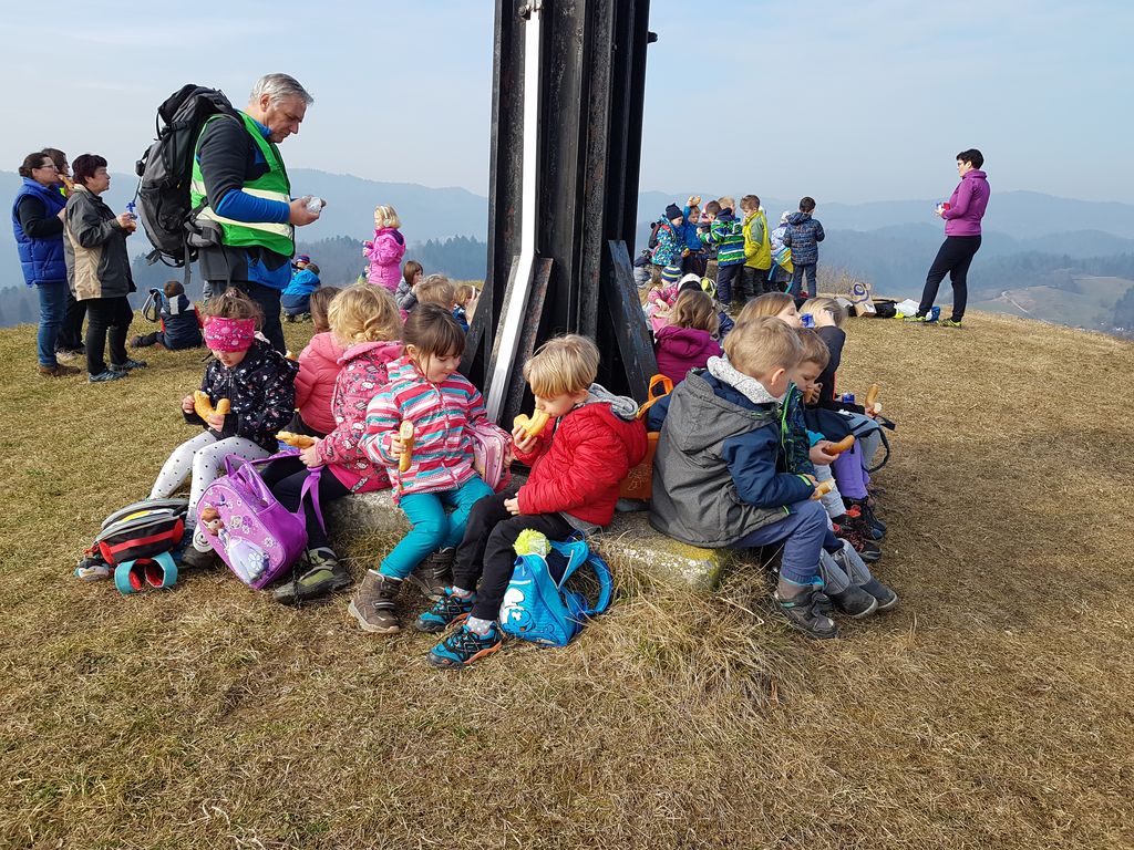 Konec februarja smo otroci in njihove vzgojiteljice iz skupin Murnov, Metuljev in Čebel odšli iz vrtca na zimski planinski izlet na Gradišče. Imeli smo zelo lepo vreme in naša pot se je vila od Ljubgojne, Zagorice, Spodnjega Gradišča vse do Žažarskega Gradišča. Hodili smo po gozdnih, travniških in vaških poteh ter uživali v številnih lepotah. Občudovali smo okoliške hribe in opazili tudi znanilce pomladi: telohe, zvončke in trobentice … In končno smo prišli na vrh – Žažarsko Gradišče. Tam smo si vzeli čas za počitek, se posedli okoli tamkajšnjega križa in se okrepčali z rogljički ter sokom. Še malo smo se poigrali na lepi planoti in uživali v lepem razgledu na Žažar.