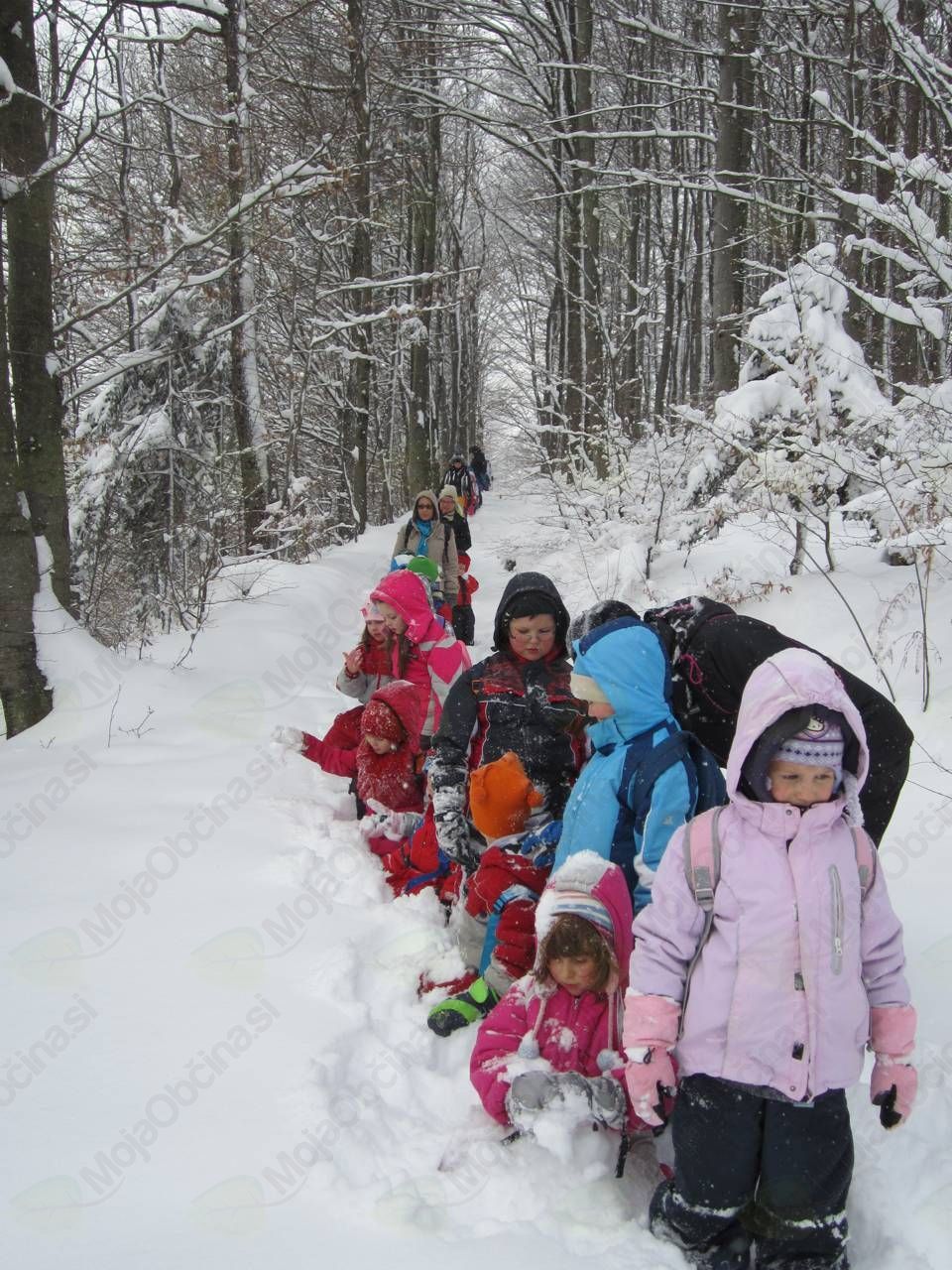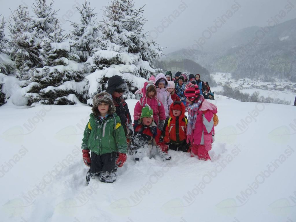 Zaradi obilo snega, ki je zapadel čez noč, smo prvotno smer pohoda, ki je bila načrtovana do Zagorice ter čez Bašev grič do Ljubgojne in vrtca, spremenili. Pot nas je vodila po glavni cesti do Ljubgojne. Tu smo zavili s ceste in po kolovozu krenili na Kucelj. Po stezah in kolovoznih poteh smo prehodili grebene gričev nad Horjulom in se po bregu nekdanjega smučišča spustili v vas ter se vrnili v vrtec. Večino poti smo v koloni gazili novozapadli sneg, zato se nam je malica, ki smo si jo privoščili nekje sredi poti, zelo prilegla. Med hojo smo opazovali Horjul, v njem iskali vrtec in druge znane zgradbe v vasi. Na drugi strani poti se nam je pogled odpiral na Zagorico, Log in Lipalico. G. Bogdan Seliger, vodja poti, nam je povedal marsikaj zanimivega o hoji v zimskih razmerah. Otroke je navdušil z umivanjem obraza s snegom. Najpogumnejši so ga posnemali, in zanimivo, prav nikogar ni zeblo.