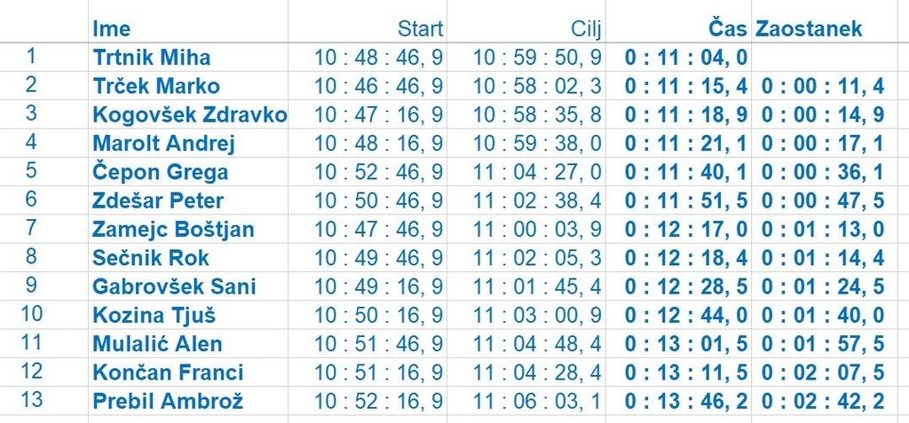 Tekmovanja se je kljub slabi vremenski napovedi udeležilo 13. članov in s tem pokazalo svojo zavzetost ter odločnost. Vreme kolesarjem tokrat res ni šlo na roko, saj je tekmovalni del potekal v dežju. Kronometer oziroma skupinska vožnja se je odvila na relaciji Mala voda (od razcepa Horjul-Butajnova-Polhov Gradec) do Polhovega Gradca v skupni dolžini 8,3 kilometrov. Zmagovalec Miha Trtnik je potrdil svojo odlično pripravljenost in na dirki vozil s povprečno hitrostjo 45 km/h kar je za deževne pogoje zelo lep dosežek.