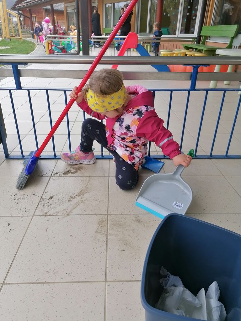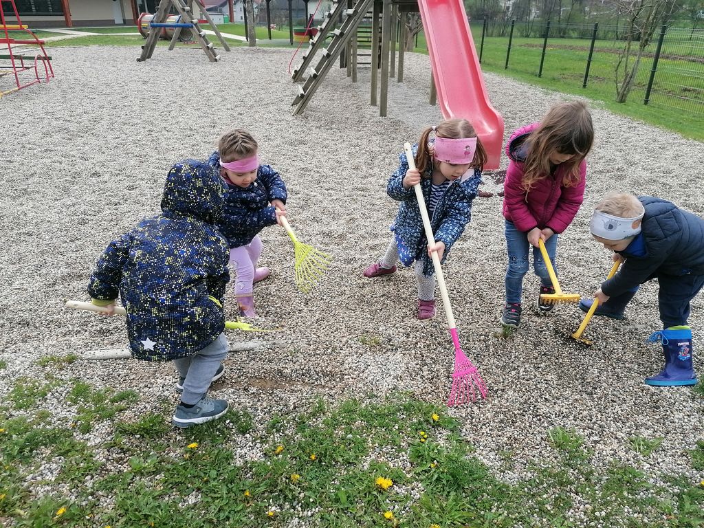 Najmlajši otroci so z delom začeli že takoj po zajtrku. Z navdušenjem so brisali stolčke, mize, vozila, blazine, pometali so teraso ter uredili igrače. Nekaj otrok je z grabljicami v rokah odkorakalo proti igrišču in pograbili so kamenje s trave nazaj v peskovnik. Med delom je iz zemlje pokukal še kakšen deževnik, ki smo ga odnesli na varno.