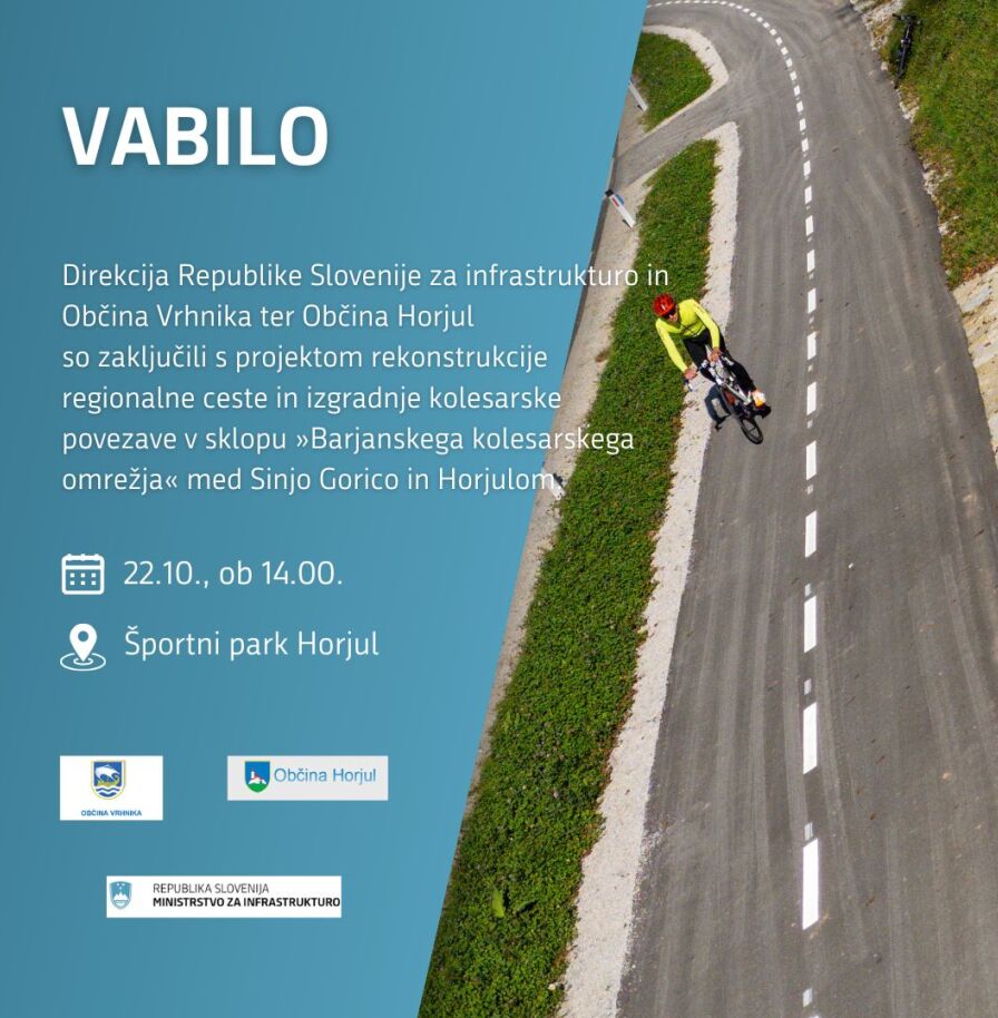 Ob zaključku projekta rekonstrukcije regionalne ceste in izgradnje kolesarske povezave v sklopu "Barjanskega kolesarskega omrežja" med Sinjo Gorico in Horjulom, vas vabimo na otvoritev, ki bo v sredo, 22. oktobra 2025, ob 14. uri, v Športnem parku Horjul, Vrhniška cesta 35, 1354 Horjul.