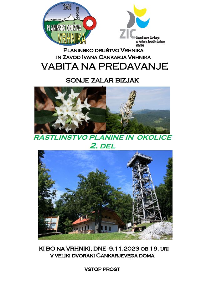 Planinsko društvo Vrhnika in Zavod Ivana Cankarja Vrhnika vas vabita na predavanje Sonje Zalar Bizjak - Rastlinstvo Planine in okolice, 2. del, ki bo 9. novembra 2023, ob 19. uri, v veliki dvorani Cankarjevega doma na Vrhniki.