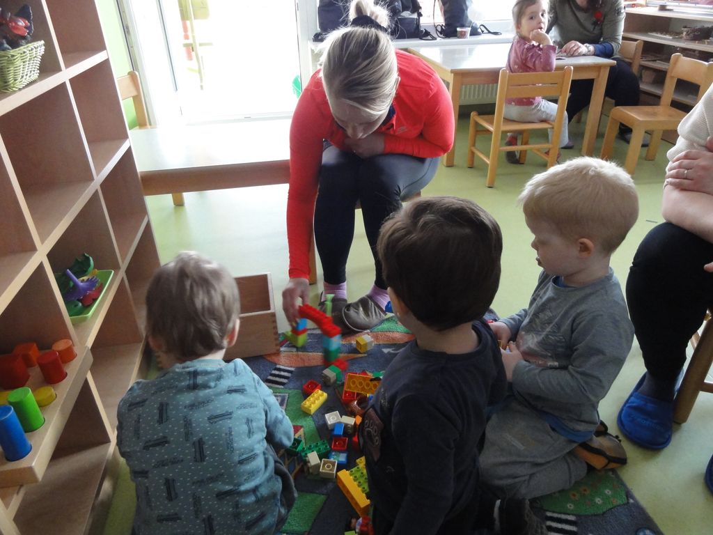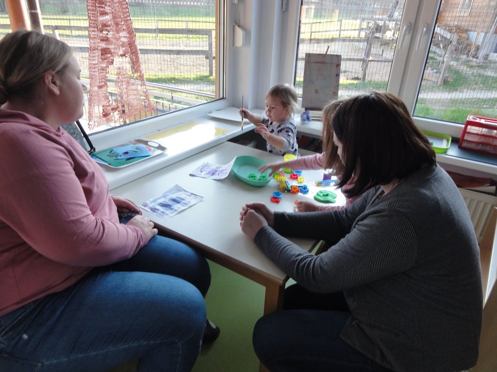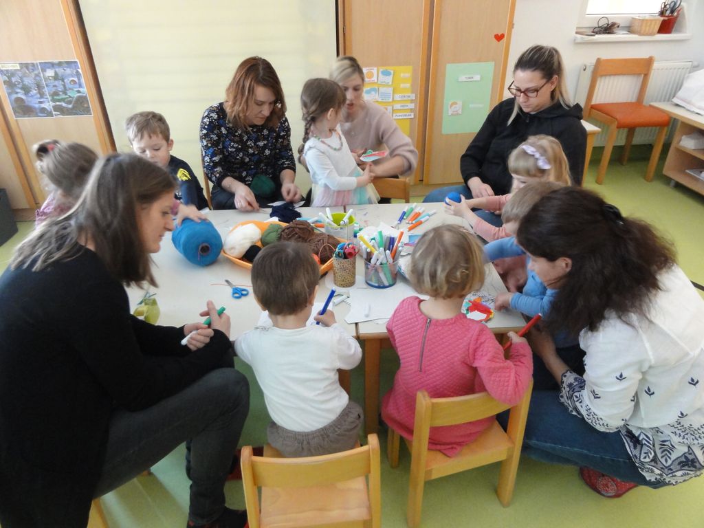 V popoldanskem času so otroci mamice pospremili do naše garderobe, kjer so se preobuli in z nasmeškom na obrazu vstopili v igralnico. Otroci so jim doživeto razkrili kotičke, kjer se igrajo, in pokazali knjige in igrače, ki so jim najbolj zanimive in ljube. Skupaj so izdelali tudi ptičke, ki sedaj krasijo našo igralnico.