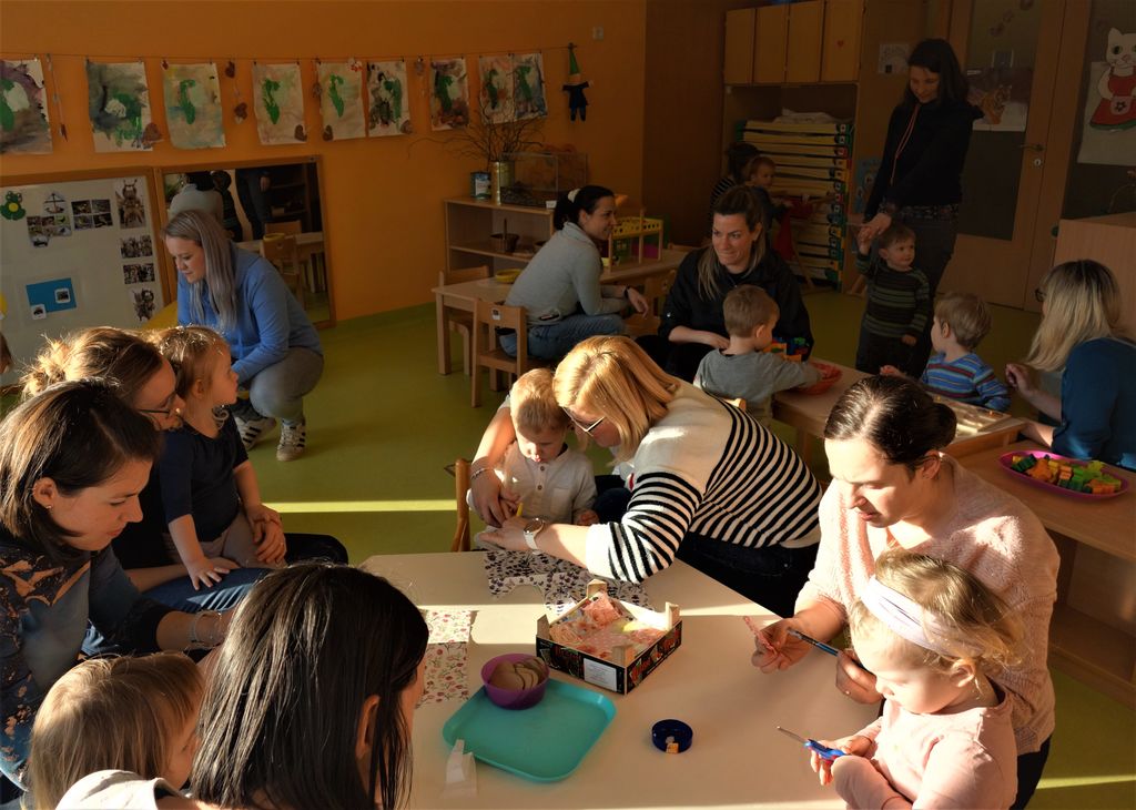 Na lep pomladni dan so se z nami v vrtec prišle poigrat mamice. Pokazali smo jim svoje najljubše igrače in kotičke. Mamice so si vzele čas in zavzeto gradile železnico ter sestavljale kocke. Skupaj smo ugotavljali, katera vozila vozijo po kopnem, plujejo po vodi ali letajo po zraku. Pokazale so nam, da z veseljem ustvarjajo in rišejo. Mi pa smo mamicam pokazali, kako zelo smo postali samostojni in spretni s škarjami. Kako znamo pospraviti igrače na svoje mesto in, seveda, da se znamo čisto sami obuti in obleči. Z mamicami nam je bilo v vrtcu lepo, oh, kaj bi dali, da bi bilo vsak dan tako.
