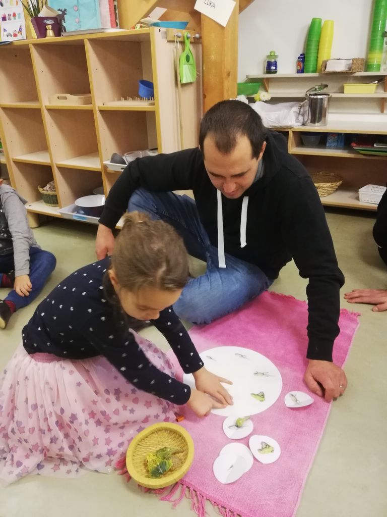 Ob samem prihodu v igralnico so otroci svoje očete povabili na ogled, zaigrali so jim lutkovno predstavo Palček Pohajalček. Predstavili so se v vlogah pripovedovalcev, lutkarjev, glasbenikov in pevcev. Očete smo čez nekaj časa še enkrat poklicali v skupino. Otroci so svojim spremljevalcem predstavili materiale s področja umetnosti, vsakdanjega življenja, zaznavanja, jezika, matematike in znanosti. Poleg dela z materiali pa so imeli na voljo še ustvarjalno delavnico, kjer so izdelovali palčkove kapice iz Das mase.
