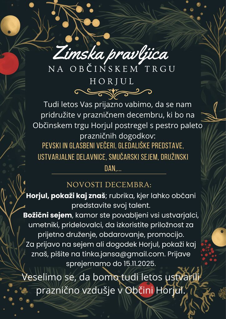 Vse ljubitelje božičnih praznikov in decemberskega vzdušja vabimo na  Občinski trg Horjul.