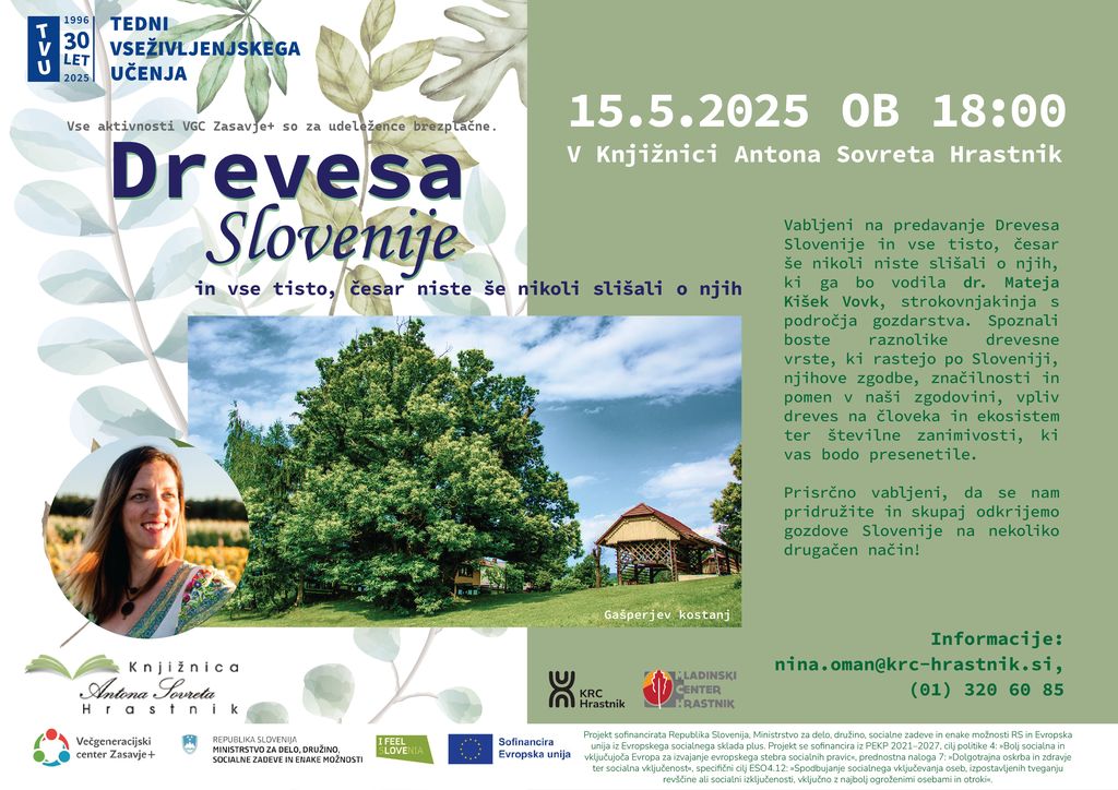 15.5.2025 ob 18:00 Vabljeni na predavanje »Drevesa Slovenije in vse tisto, česar še nikoli niste slišali o njih«, ki ga bo vodila dr. Mateja Kišek Vovk, strokovnjakinja s področja gozdarstva. Spoznali boste raznolike drevesne vrste, ki rastejo po Sloveniji, njihove zgodbe, značilnosti in pomen v naši zgodovini, vpliv dreves na človeka in ekosistem ter številne zanimivosti, ki vas bodo presenetile.