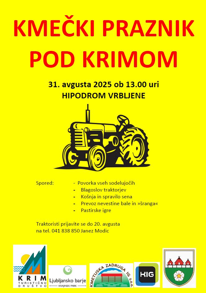 Turistično društvo Krim vabi na 5. KMEČKI PRAZNIK POD KRIMOM v nedeljo, 31. avgusta 2025, ob 13.00 uri na Hipodrom Vrbljene.