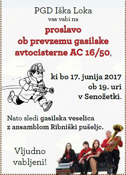 PGD Iška Loka vabi na proslavo ob prevzemu gasilske avtocisterne, ki bo v soboto, 17. junija 2017 ob 19. uri v Senožetki. Sledila bo gasilska veselica z ansamblom Ribniški pušeljc. Vabljeni