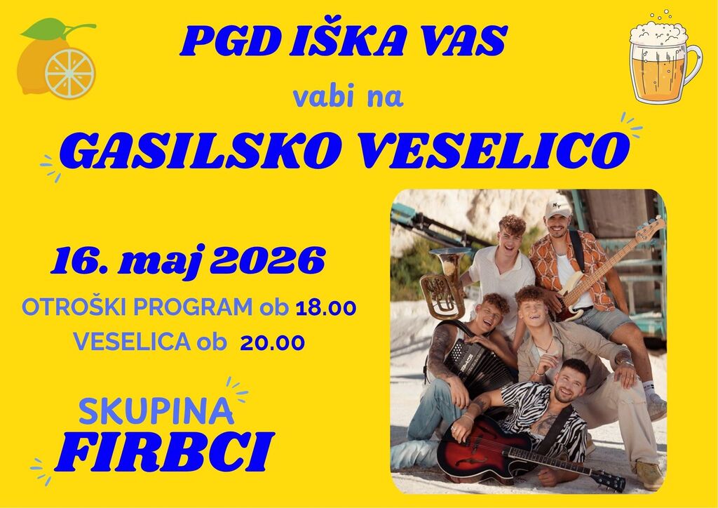 PGD Iška vas vabi na gasilsko veselico - začetek otroškega programa ob 18.00, začetek veselice ob 20.00. Zabavala vas bo skupina Firbci!