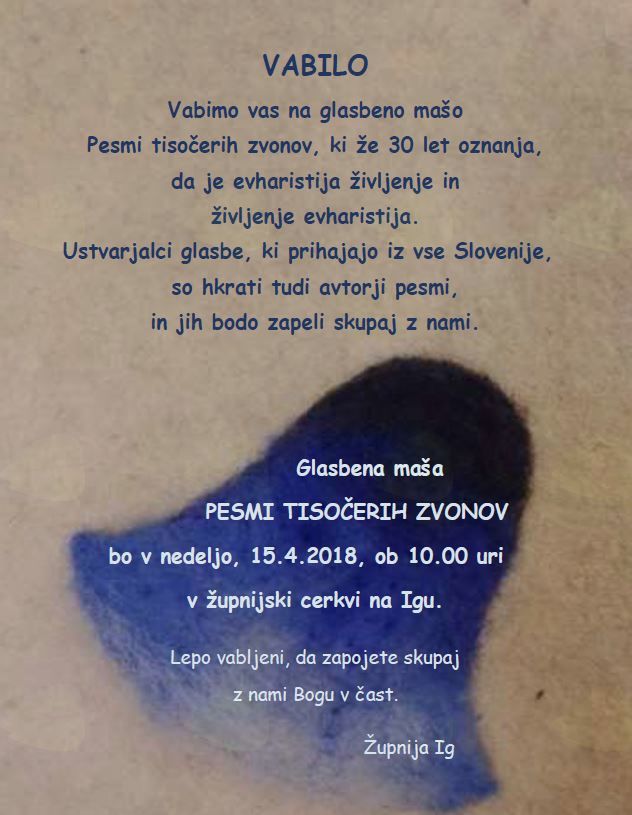 Vabljeni na glasbeno mašo, v cerkev sv. Martina na Igu, z naslovom: Pesem tisočerih zvonov. Ustvarjalci glasbe prihajajo iz vse Slovenije so hkrati tudi avtorji pesmi in bodo zapeli skupaj z nami! Lepo vabljeni da zapojete skupaj z nami!