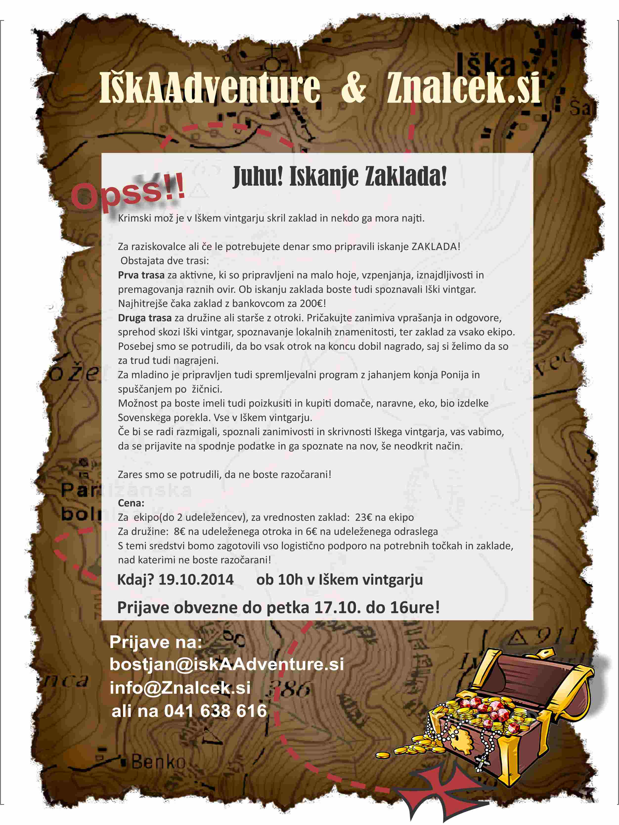 Ena trasa za aktivne, ki so pripravljeni na malo hoje, vzpenjanja, iznajdljivosti in premagovanja raznih ovir. Ob iskanju zaklada boste tudi spoznavali Iški vintgar. Najhitrejše čaka zaklad z bankovcom za 200€!