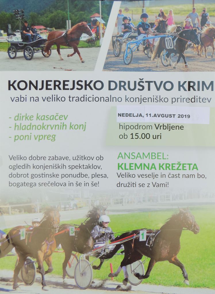 Konjerejsko društvo Krim v nedeljo, 11. avgusta 2019 s pričetkom ob 15.00 uri prireja tradicionalno prireditev poimenovano kar "KONJENIŠKI PRAZNIK NA HIPODROMU VRBLJENE"