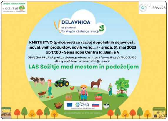 Vabljeni na LAS delavnico Kmetijstvo - priložnosti za razvoj dopolnilnih dejavnosti, inovativnih produktov, novih verig, ki bo v sredo, 31. maja ob 17. uri v sejni sobi Centra Ig, Banija 4, za pripravo Strategije lokalnega razvoja za programsko obdobje do leta 2027.