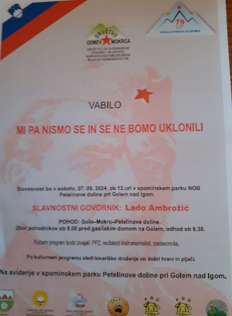 Društvo Odmev Mokrca vabi na slovesnost Mi pa nismo se in se ne bomo uklonili, ki bo v soboto, 7. septembra ob 12.00 v spominskem parku Petelinove doline pri Golem nad Igom. Slavnostni govornik bo Lado Ambrožič. V kulturnem programu bodo sodelovali: Partizanski pevski zbor ter recitatorji in glasbeniki. Sledilo bo tovariško druženje ob dobri hrani in pijači.