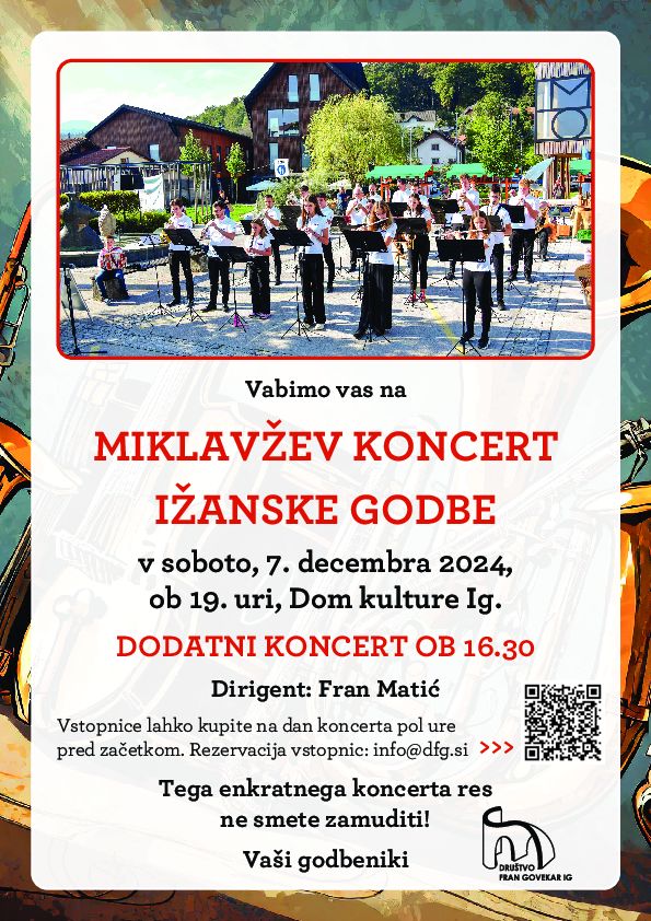 Vabljeni na 1. Miklavžev koncert Ižanske godbe v soboto, 7. decembra 2024, ob 19. uri, v Domu kulture Ig.