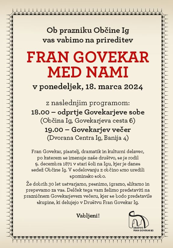 Društvo Fran Govekar Ig in Občina Ig vabita na odprtje Govekarjeve sobe v pritličju občine (Govekarjeva cesta 6), v ponedeljek, 18. marca 2024 ob 18.00.