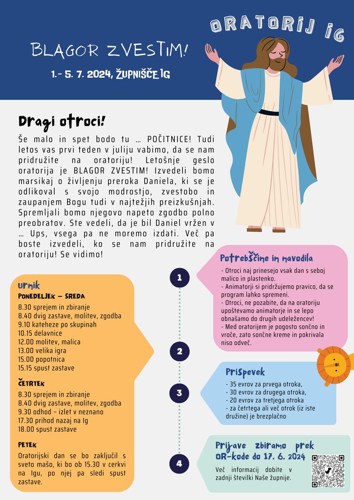 Župnija Ig tudi letos vabi otroke, da se jim pridružite na oratoriju, ki bo prvi teden v juliju, od 1. 7. do 5. 7. Letošnje geslo oratorija je BLAGOR ZVESTIM! Izvedeli boste marsikaj o življenju preroka Daniela, ki se je odlikoval s svojo modrostjo, zvestobo in zaupanjem Bogu tudi v najtežjih preizkušnjah. Spremljali boste njegovo napeto zgodbo polno preobratov. Ste vedeli, da je bil Daniel vržen v …