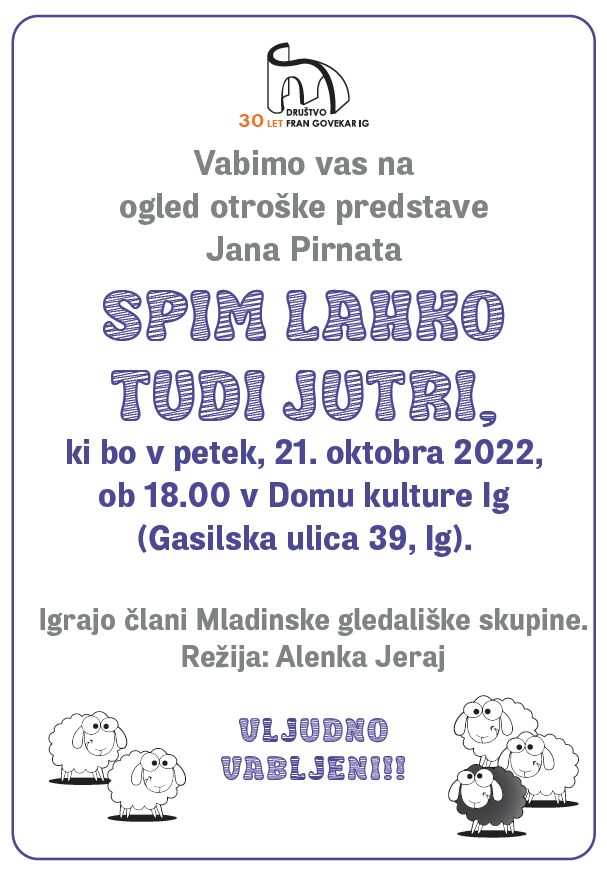 Društvo Fran Govekar Ig vabi na otroško predstavo Spim lahko tudi jutri!