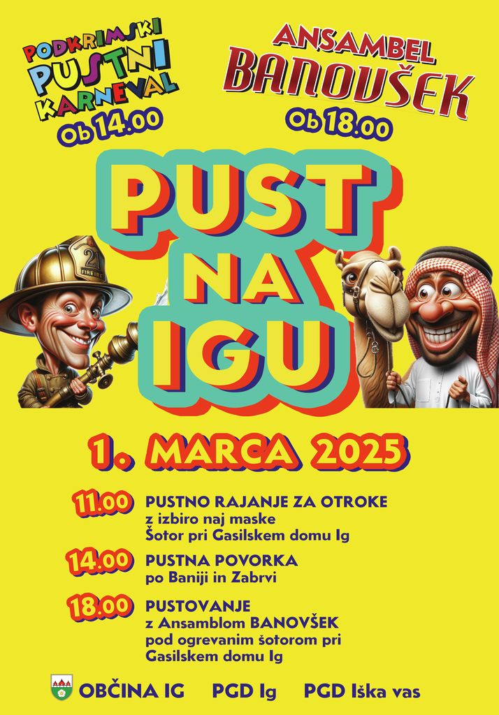 Bliža se čas, ko bodo pustne maske ponovno prevzele oblast na Ižanskem. Občina Ig v sodelovanju s PGD Ig in PGD Iška vas v soboto, 1. marca 2025 vabi na pustovanje na Igu. Ob 11. uri otroški program in izbor naj maske v šotoru pri gasilskem domu na Igu, ob 14. uri Podkrimski pustni karneval - povorka mask po ulicah Iga, od 18. ure naprej pustovanje z ansamblom Banovšek pod ogrevanim šotorom pri gasilskem domu Ig. Za hrano in pijačo bo poskrbljeno!