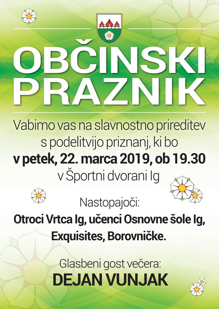 Občina Ig 21. marca praznuje občinski praznik kot spomin na uporne ižanske kmete, ki so daljnega leta 1848 ravno na ta dan vzeli zgodovino v svoje roke in za boljši jutri vseh postavili na kocko svoja življenja. Vabimo vas na slavnostno prireditev s podelitvijo priznanj ob občinskem prazniku, ki bo v petek, 22. marca 2019, ob 19.30 v Športni dvorani Ig. V programu bodo sodelovali: otroci Vrtca Ig, učenci Osnovne šole Ig, Exquisites, Borovničke in glasbeni gost večera Dejan Vunjak.