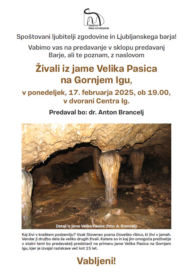 Vabimo vas na predavanje v sklopu predavanj Barje, ali te poznam, z naslovom Živali iz jame Velika Pasica