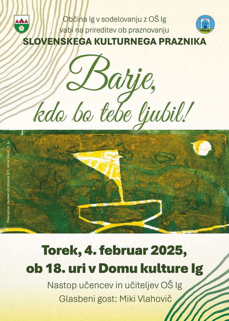 Občina Ig v sodelovanju z OŠ Ig vabi na prireditev ob praznovanju SLOVENSKEGA KULTURNEGA PRAZNIKA Barje, kdo bo tebe ljubil!